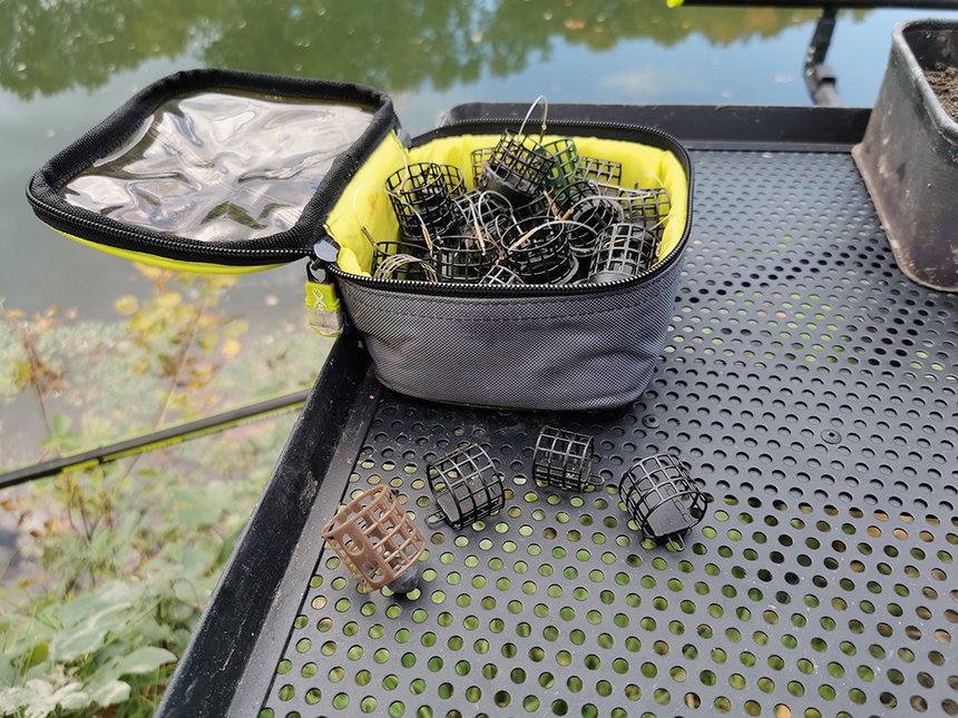 Toujours avec ce souci constant de discrétion, l’impact du feeder avec l’eau doit être le plus délicat possible en prenant garde de bien accompagner le montage en fin course, au moment où la ligne vient en butée sur le line-clip. Les tout petits feeders rockets à cage plastique sont les plus discrets. Les formes classiques avec plombée latérale sont disponibles elles aussi dans des tailles à peine plus grosses qu’un ongle, dans des poids plumes donc. En eau froide et très claire, il est inutile d’amorcer au préalable sous peine de faire fuir les poissons. Je n’hésite pas à utiliser directement ces cages minuscules pour pêcher immédiatement.