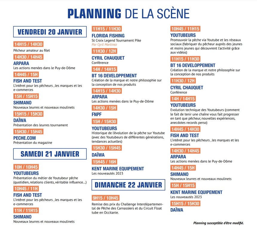 Si l’aquarium géant a disparu, il y aura toujours une grande scène pour des interviews et conférences. La FNPF s’y risquera, samedi de 14h30 à 15h. Les YouTubeurs présenteront leurs activités et conseilleront les plus jeunes qui veulent se lancer ! Shimano, Daiwa, Florida Fishing et d’autres encore présenteront leurs nouveautés et activités.