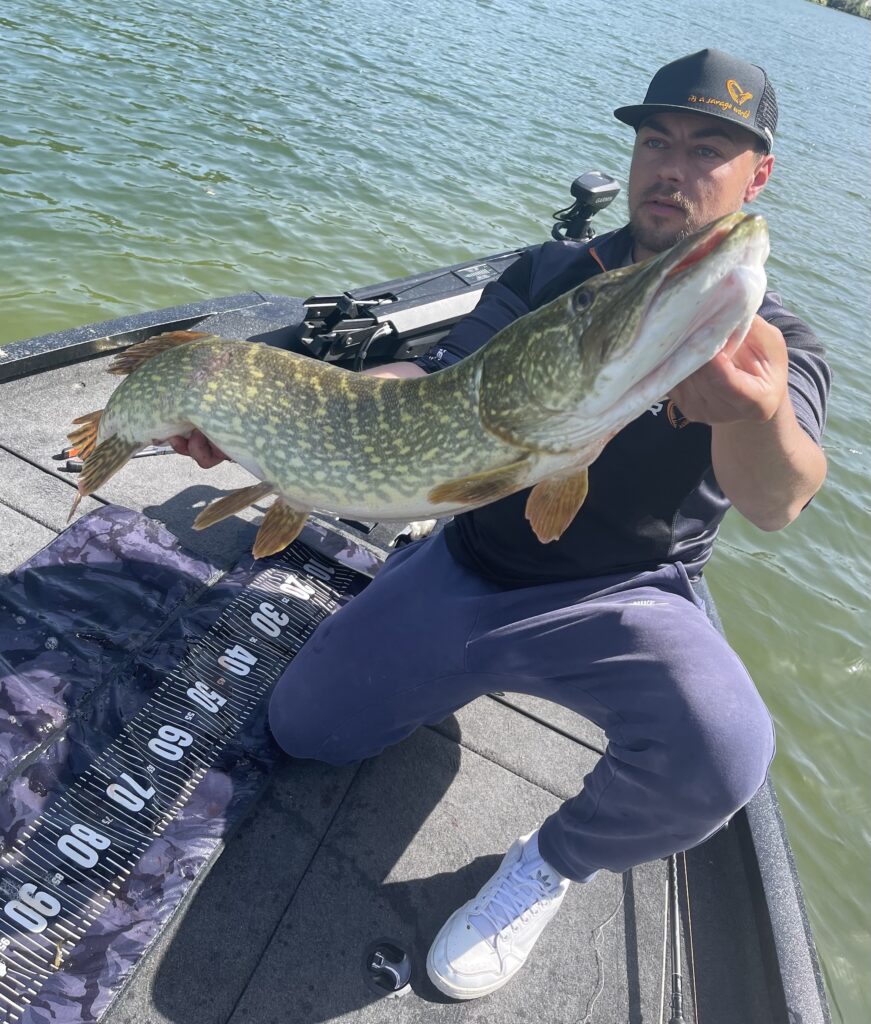 Après quelques heures de pêche, un très gros poisson suit mon leurre jusqu’au bateau avant de replonger dans les profondeurs. Je change alors d’animation et accélère la récupération, ponctuée de pauses de quelques secondes. Je persévère, et une heure plus tard, c’est la touche tant attendue ! Une frappe phénoménale, bien plus brutale que d’habitude : arrêt net, gros ferrage, et là, je distingue la tête massive d’un brochet émergeant de l’eau. Je crie à mon frère : “Sors l’épuisette, il est ÉNORME !”