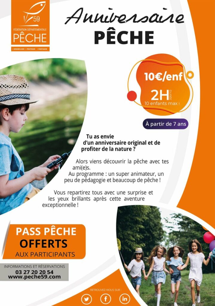 La fédération de pêche du Nord organise des anniversaires-pêche pour les plus de 7 ans, encadrés par un animateur diplômé d’état. L’idée est excellente : les réservations se font au minimum 15 jours à l’avance, les animations durent deux heures et ont lieu les mercredis et samedis. Le matériel est fourni, les groupes sont composés…