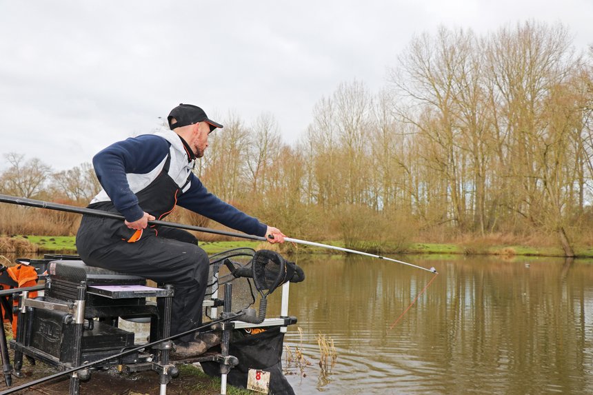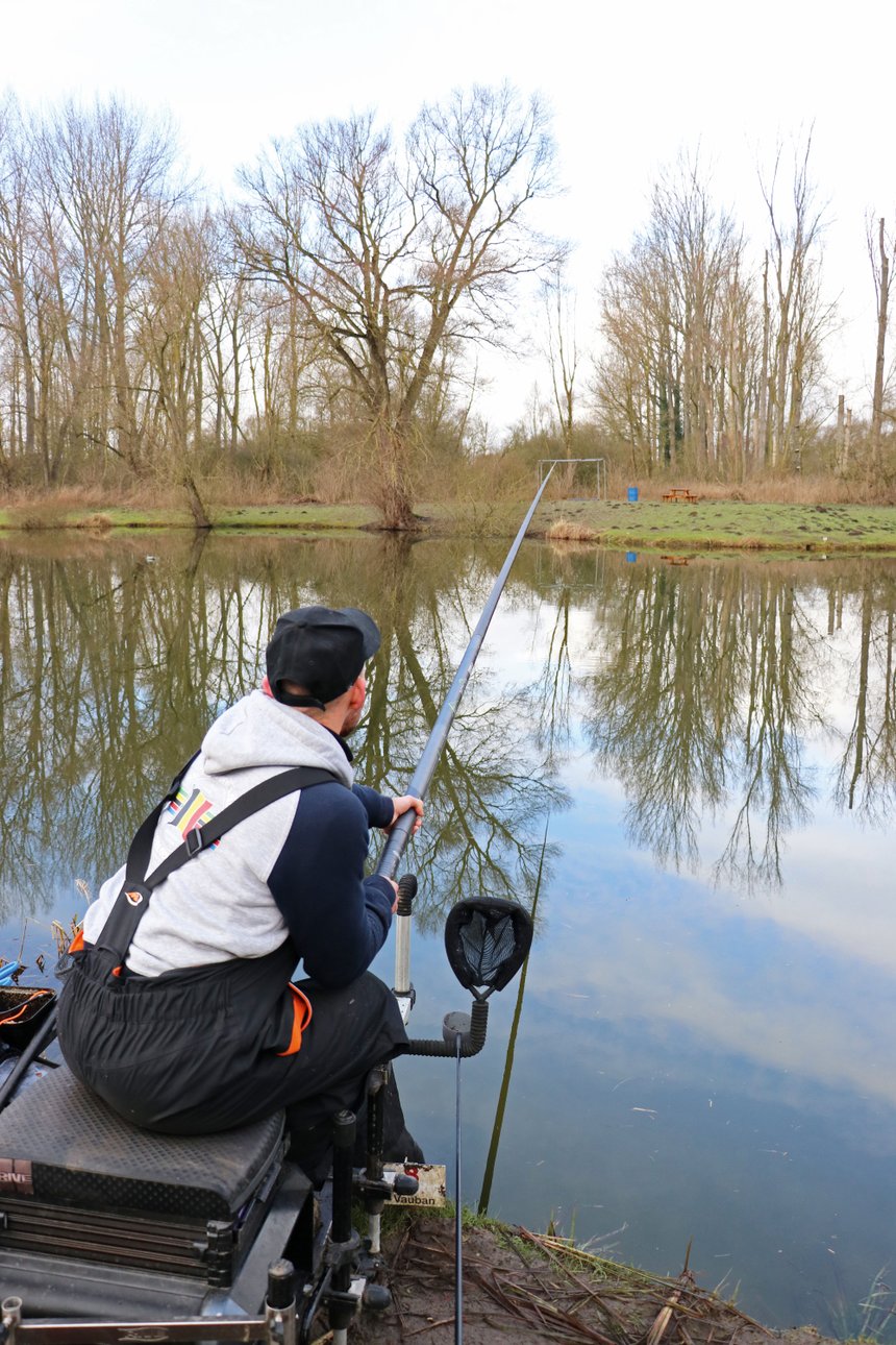Thomas prospecte à 5 ou 6m du bord pour trouver cette sorte de première marche que les poissons fréquentent naturellement puisque régulièrement fournie en nourriture. Il s’agit maintenant de déterminer un second coup, à distance de grande canne. À 10, 11 ou 13m ? Là aussi, c’est le sondage qui décide. Thomas tente de repérer le spot le plus creux possible car à cette saison, il sait que les beaux poissons vont s’y réfugier. Il explore toute la largeur accessible depuis son poste et n’hésite pas à se déporter pour dénicher une petite zone la plus plane mais aussi la plus profonde possible. Pour aujourd’hui, ça se précise à deux mètres à droite de son premier coup de bordure.