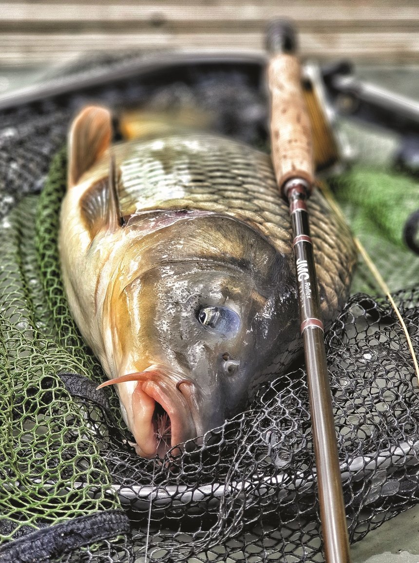 Concernant la carpe, sa pêche à vue suscite maintenant de vraies passions un peu partout dans le monde et, vu les populations que nous avons dans l’Hexagone, de très belles pêches sont possibles. La majeure partie du temps, les carpes se nourrissent de larves et de mollusques ; lorsqu’elles font du « tailing », il est assez facile de les faire mordre. En rivière comme en gravière, partout où l’eau claire permet de bien les observer, leur pêche à la mouche est un régal, mais le matériel devra être adapté à leur taille !