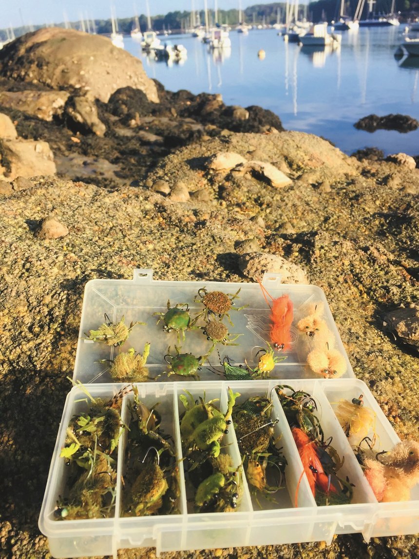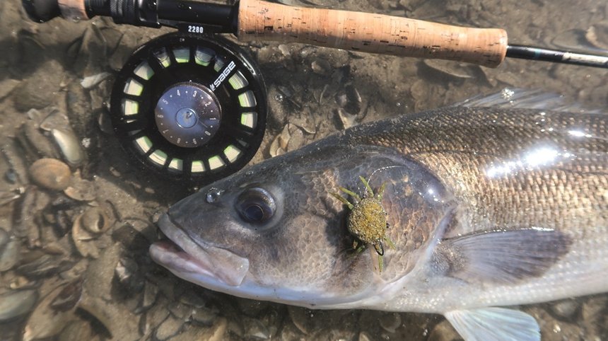 En mer ouverte, que ce soit du bord ou en bateau, un ensemble de 9 pieds soie de 9 permet d’avoir une bonne réserve de puissance. Une soie WF flottante et une bobine avec une soie intermédiaire spécial mer de type Rio Striper sont plus adaptées pour un usage régulier. Un bas de ligne d’une longueur et demie en 27 à 30° en fluorocarbone complétera l’ensemble. Concernant le nœud, pour monter un streamer, j’utilise le perfect loop, permettant de laisser de la liberté à la mouche qui sera plus mobile et attractive. En estuaire ou pour les pêches à vue, une canne de 9 pieds soie de 8 sera plus adaptée pour avoir des posés plus doux et délicats. Une imitation de crabe ou de crevette permet de couvrir les occasions que l’on retrouve dans ces pêches à vue. Des petites imitations de petits poissons peuvent aussi compléter la panoplie.