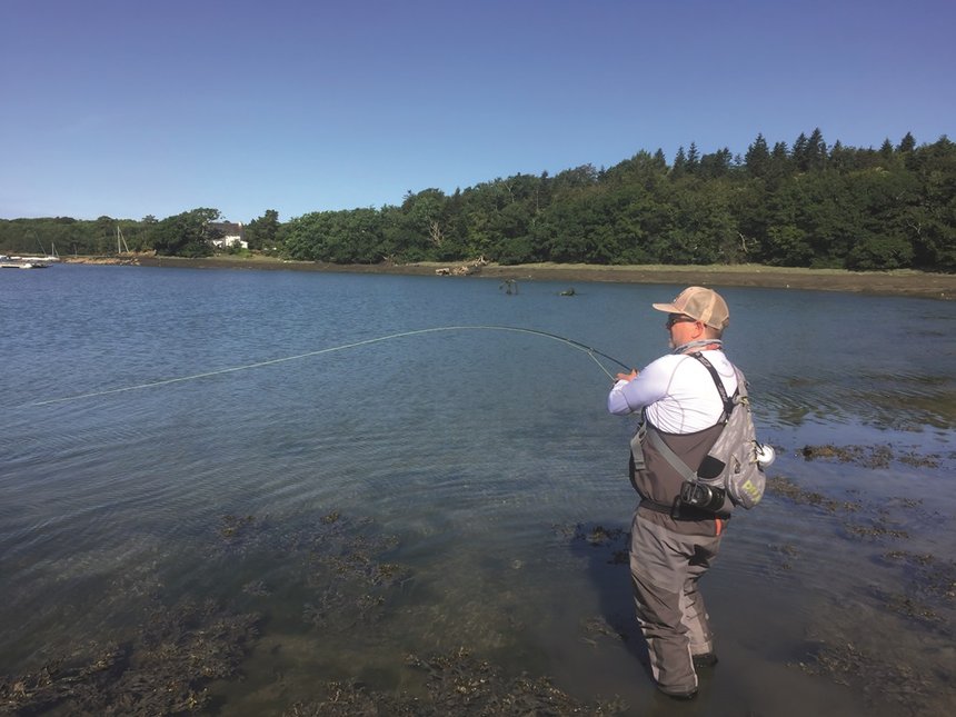 Prenez une canne de type réservoir de 9 à 10 pieds soie de 7 ou 8. Une soie flottante WF, un bas de ligne sans nœud ou que vous fabriquerez avec 3 ou 4 brins en fluorocarbone (dégressifs en taille et longueur), le tout d’une longueur d’une canne et demie, puis quelques streamers de 10 à 15 cm en taille 4 à 1/0 en plusieurs coloris. Un panier à lancer est tout de même d’une grande aide pour ne pas abîmer votre soie et surtout vous accrocher partout. Essayez de sortir par coefficients entre 50 et 80 maximum. Ce sont les plus réguliers pour le bar mais aussi le mulet. Tentez différents coins, mais cherchez un endroit où vous pouvez passer d’un type de milieu à un autre rapidement comme décrit plus haut. La lecture de l’eau est importante aussi, en mer comme en eau douce. Pêchez en éventail sur un poste pendant 20 à 30 minutes puis changez d’endroit. Les arrivées d’eau douce, les baies, les pointes rocheuses sont souvent des zones de passages. Observez si vous voyez des proies potentielles comme des petits poissons, des crevettes, des crabes et regardez bien dans vos pieds, car les bars viennent dans très peu d’eau. À l’inverse, levez les yeux pour voir si les oiseaux (sternes notamment et cormorans) sont actifs et chassent eux aussi.