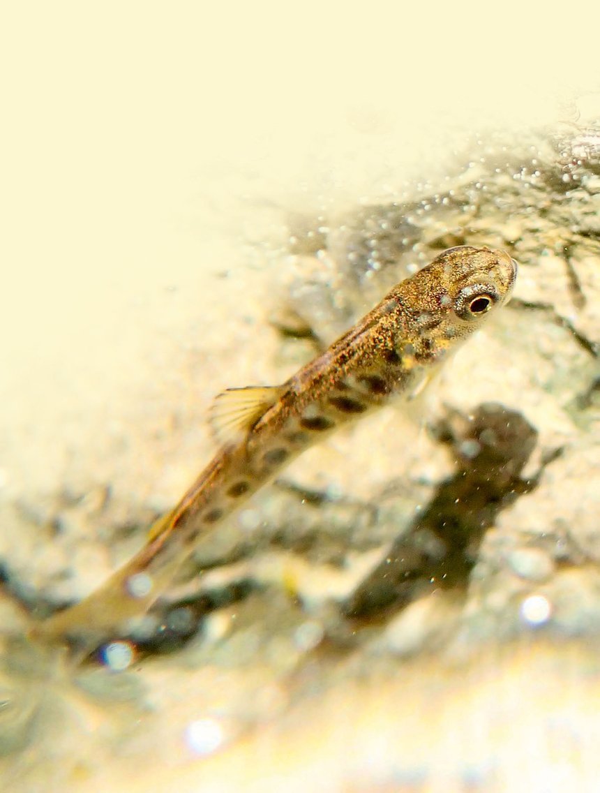 La rapidité de maturation de l’œuf est entièrement dépendante de la température de l’eau. On dit qu’il faut environ 400 degrés-jours pour assister à l’éclosion chez la truite, c’est-à-dire 40 jours d’incubation à 10°C ou 80 jours à 5°C, etc. L’éclosion est une phase transitoire et si certaines autres espèces de poissons sont dès l’éclosion des animaux autonomes, notre salmonidé doit encore poursuivre son développement à l’abri et dans l’obscurité de sa frayère. À cette étape, sa vésicule vitelline imposante empêche totalement la larve de nager. Durant encore plus de 300 degrés-jours supplémentaires, cette poche ventrale fonctionne comme une réserve qui assure les besoins vitaux de la fragile larve… Dès sa résorption, c’est l’émergence : la larve est maintenant un alevin qui s’extirpe énergiquement de son nid de graviers. Il rejoint directement la surface de la rivière pour percer l’interface et venir piper une bouffée d’air atmosphérique, qui va gonfler sa vessie natatoire. Cette étape majeure est indispensable à la nage et à la stabilisation de l’alevin en pleine eau. La vésicule vitelline a disparu et les truitelles, maintenant autonomes, sont prêtes à affronter la vie et devenir les belles et rusées mouchetées que nous voyons gober tous les week-ends !