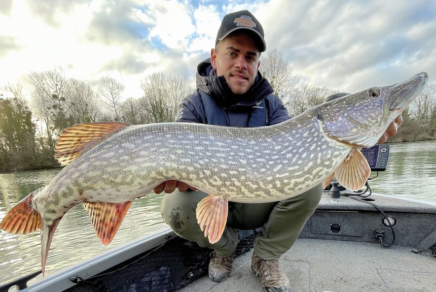 Un premier brochet qui a attaqué un streamer jaune orange monté par le guide Tanguy Demule