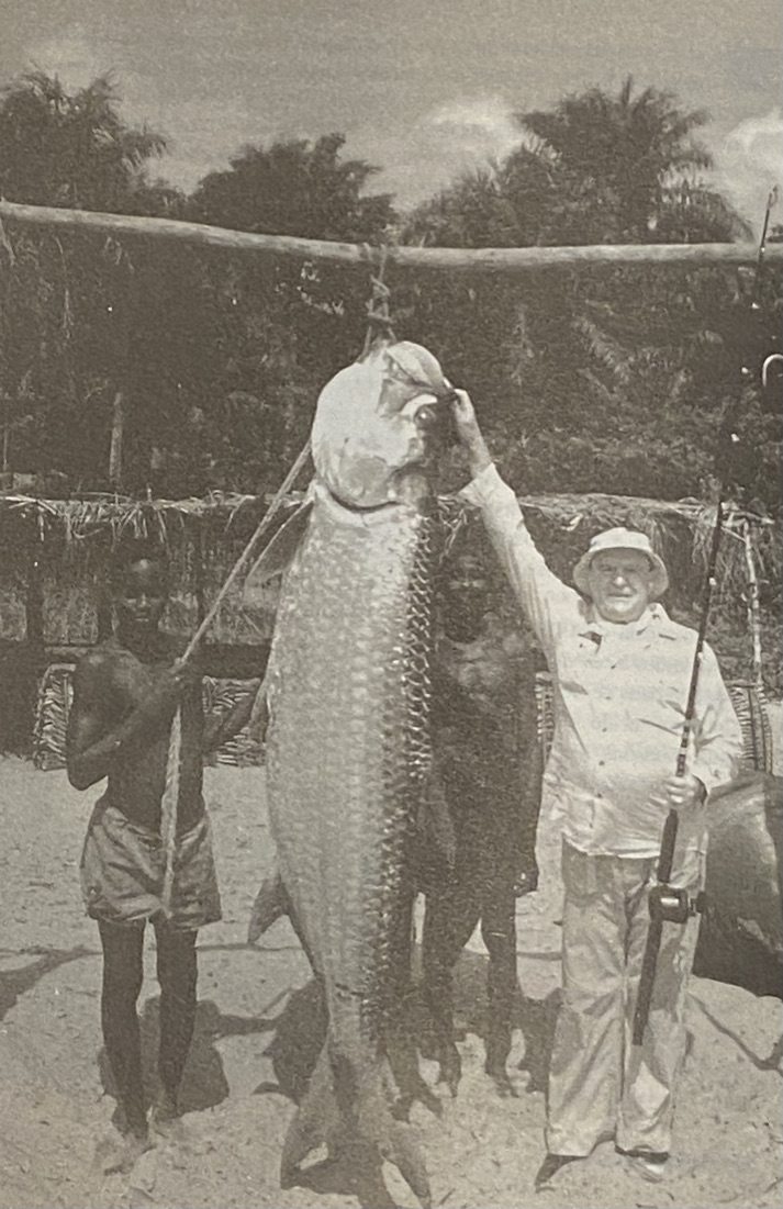 Mais revenons à la pêche : le 31 mars, dernier jour de nos deux semaines à Sherbro, alors que la plupart d’entre nous avaient pris et relâchés pour la plupart des tarpons dépassant et de loin les cent kilos (environ 220 livres anglaises), Pierre, sur ligne de 50 livres, combattit avec succès et en stand up, il n’y avait de toutes façons pas de siège de combat sur les petits « Carolina skiffs » du camp de pêche, un énorme tarpon de 122,9 kg, soit 271 livres anglaises, qui est encore aujourd’hui le record du monde homologué sur ligne de 50 livres.