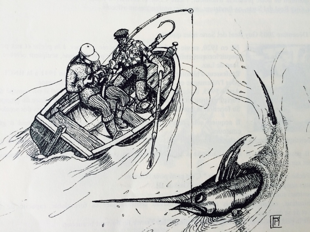 La preuve : « « Ca y est, je le tiens et il est lourd. Aussitôt piqué, il décampe irrésistiblement. Chico rame désespérément pour le suivre…pendant deux heures passées, il nous a mené la vie dure, mais maintenant mon espadon s’est installé à cinquante brasses de profondeur, au ras probablement d’une couche d’eau dont la température lui agrée, et il ne veut pas plus en bouger qu’un toro de sa « querencia »…..18 h 30 et bientôt sept heures de combat. La brise de l’après-midi qui s’était levée retombe avec le soleil bas. Je sens l’espadon qui cède enfin… J’enfile mon caban et un bonnet de laine…. L’espadon a sondé quatre cent mètres au moins, mais n’est pas mort, et je sue sang et eau pour le remonter. Je force ma main engourdie crispée sur la manivelle et mon bras douloureux à tourner, à tourner encore! Puis sans prévenir arrivent la ligne double et l’émerillon. Chico remonte le bas de ligne doucement et je plonge la gaffe dans l’eau à bout de bras. La profondeur est difficile à juger, et il me faut gaffer l’espadon sans coup férir à la hauteur de sa carène caudale pour mieux l’immobiliser. Hop! Décidément, j’ai de la chance. Le croc est bien placé. Carlos lance le lasso tout préparé, je le passe pour une fois sans difficulté, et c’est terminé. Le poisson et le youyou enfin hissés à bord du Batalha, je m’affale sur le pont à côté de mon espadon que j’admire à la lueur de la lampe électrique. Il a une rare longue épée, sans défaut, et son corps est parfaitement proportionné. » Voilà ce qu’était la grande pêche sportive il y a encore quelques décennies seulement.