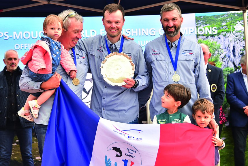La tension est à son comble pour cette dernière session et je décide de remonter aux Camporells pour suivre Sébastien Delcor dans cette dernière ligne droite. Il faut rappeler que ce titre de champion du monde individuel est le seul qui lui manque, ayant dominé tellement de fois les compétitions de pêche à la mouche sans l’obtenir. La pression sur ses épaules est grande. Lionel, qui pêche aujourd’hui l’Aude, a également une mission de taille : battre l’impressionnant Michael Bradley qui est dans sa poule et de préférence le mettre assez loin derrière ! Seb a une rotation moyenne sur les Camporells et commence malheureusement en plein vent, donc avec très peu d’activité. Dès le début, il casse un premier poisson, pas habituel chez lui, puis un second… Seb ne fait qu’un poisson sur cette première rotation. Il se rattrape ensuite très bien sur le deuxième secteur avec six beaux poissons marqués. L’Espagnol, Andres Torres, fait la course en tête et un chassé-croisé commence. Sébastien est sûr d’être champion du monde individuel s’il finit premier ou deuxième de cette session. En cas de place de troisième, tout dépendra des autres et notamment de Michael Bradley qui est deuxième au général. Seb va prendre encore quatre truites et en décrocher une dix secondes avant la fin. Il est à 15 poissons, donc deuxième car Andrés finit à 17 ! Commence alors le calcul de la taille de tous les poissons pris et notés par les contrôleurs sur les feuilles de marque : Seb gagne pour 1 cm de plus que l’Irlandais ! Super Thierry, en bon manager, retrouve avec beaucoup d’émotion son capitaine habituel, fer de lance de cette incroyable équipe. Les nouvelles arrivent et sont excellentes. Lionel a gagné de main de maître l’Aude avec une douzaine de poissons d’avance sur le deuxième et mettant Michael Bradley à la quatrième place. Greg a gagné le Vicdessos (il l’avait annoncé la veille !), Julien a encore gagné sur la Têt et Pierre a su brillamment tenir à distance l’excellent David Arcay pour remporter le Carlit. N’en jetez plus, la coupe est pleine ! Nos champions et amis se congratulent, quelques larmes glissent entre les sourires ! Nous avons trois Français sur le podium individuel, une performance jamais vue ! Un grand merci à cette équipe pour nous avoir fait vivre de grands moments d’émotions et, surtout, ne changez rien !