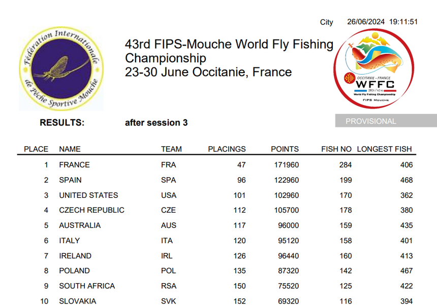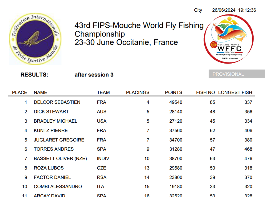 Thierry Lelièvre, manager de l’équipe de France de pêche à la mouche, nous transmet les premeirs résultats non officiels. Si Sébastien Delcor termine en tête sur l’Aude, avec 48 poissons, le double de son poursuivant immédiat, les autres Français ont rencontré plus de difficultés :
