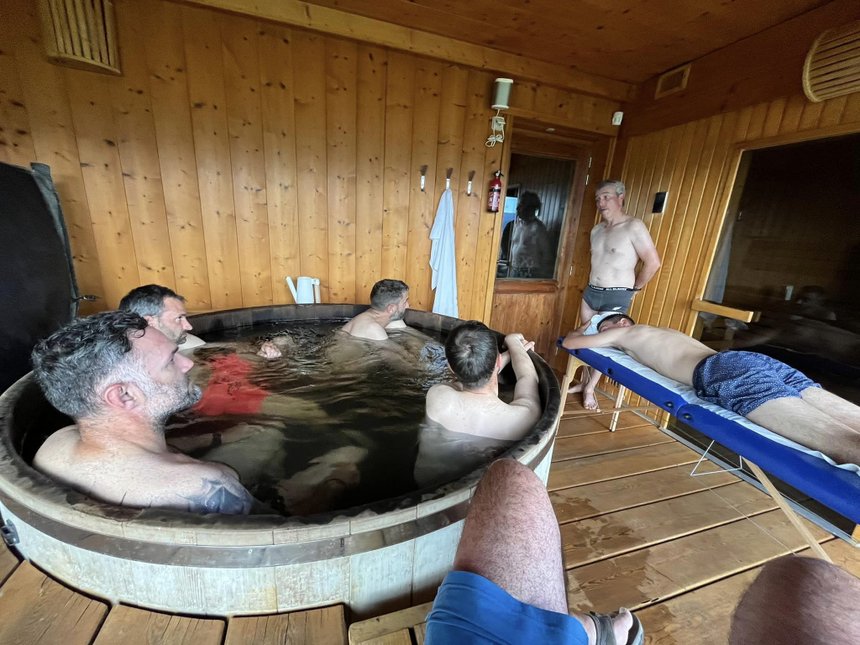 Une petite image encore ce matin, pendant que les concurrents voyagent en bus : celle du débrief hier soir, pendant la récupération, au chalet des Bleus… rien de mieux que de soulager les muscles meurtris dans l’espace nordique ! Ils ne sont pas beaux, nos champions ?