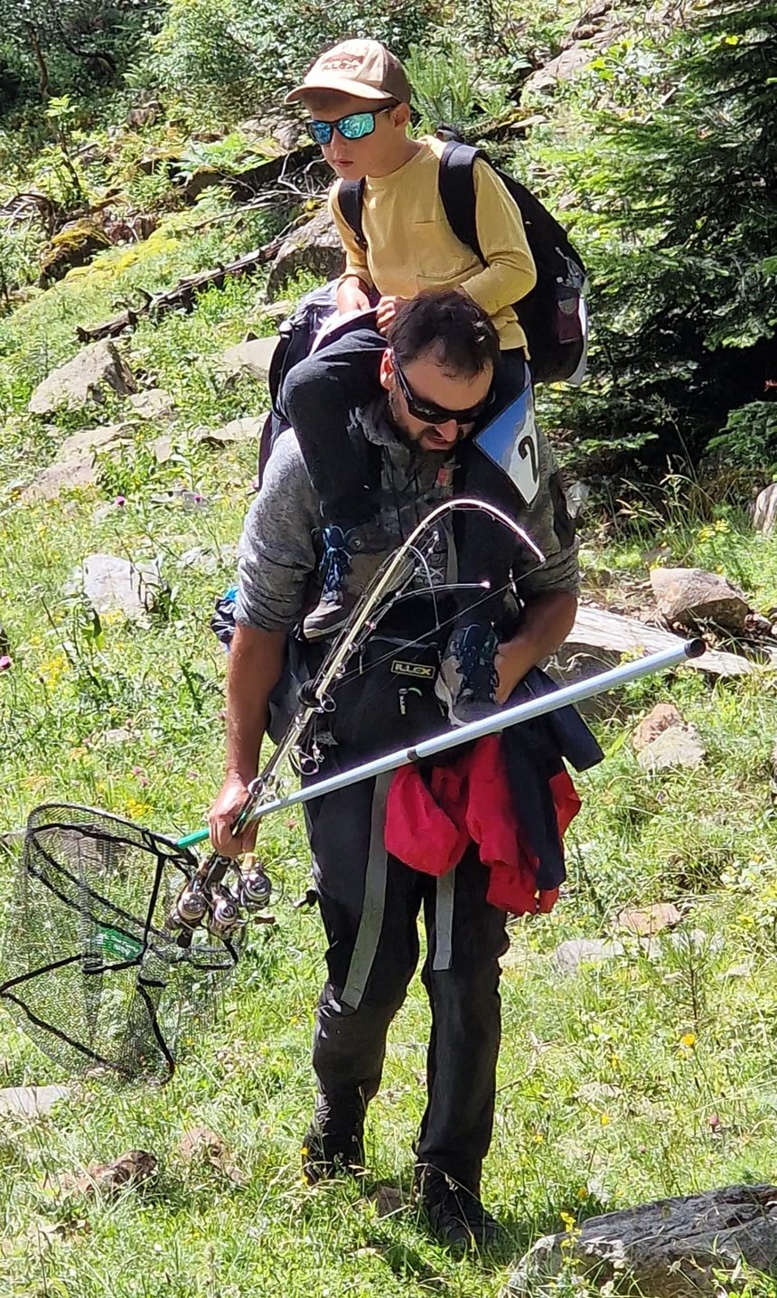 L’autre belle histoire est celle de Morgan et Marc Calu, le père et le fils (âgé de 7 ans) ont pris la 7ème place, le papa portant parfois son jeune coéquipier sur les épaules en plus de tout le matériel ! Le fiston, remplaçant au pied levé de Thomas Vogels, blessé, a pris 3 cristivomers et 1 fario, et parcouru quelques 50 km avec 3500m de dénivelé positif…