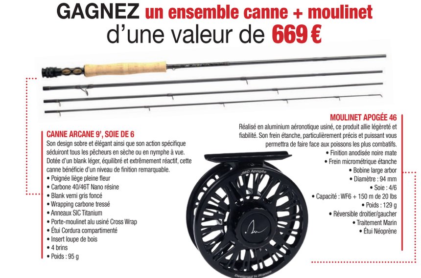La canne à gagner est une Arcane 9 pieds, soie de 6. Le moulinet est l’Apogée 46. L’ensemble ne pèse que 224 grammes. Pour jouer, il vous faut remplir le bulletin de participation qui se trouve page 75 du magazine Pêche Mouche n°149. Il vous faudra le renvoyer avant le 25 avril pour participer au tirage au sort. le nom du gagnant sera annoncé sur notre site. Bonne chance !