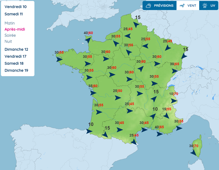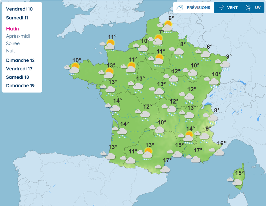 Météo France prévoit pour ce samedi une rivière atmosphérique : autant dire beaucoup de pluie et des cumuls parfois importants (Jura, Alpes du Nord). Nous aurons des températures au-dessus des normales de saison, avec la barre des 20 degrés qui sera franchie dans le sud de la France. Attention aussi au vent, qui va géner la pêche ! Attention, ces cartes de Meteo France ne sont que des prévisions, datant de mardi soir.