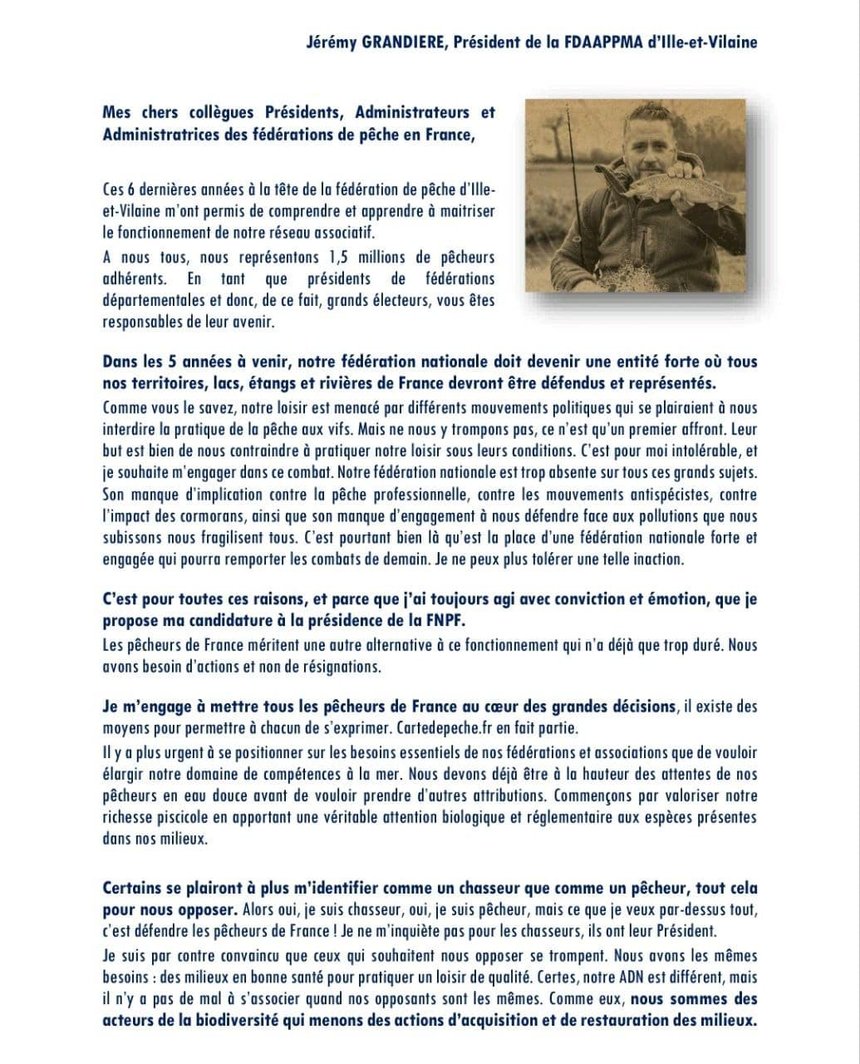 Commençons par Jèrémy Grandière, président de la fédération de pêche d’Ille-et-Vilaine. Pour sa campagne, il a choisi l’offensive en fustigeant d’abord « l’inaction » de la FNPF sur les grands dossiers (cormorans, anti-spécistes, pollutions, pêcheurs professsionnels…) : « les pêcheurs de France méritent une autre alternative. Nous avons besoin d’actions et non de résignations ».