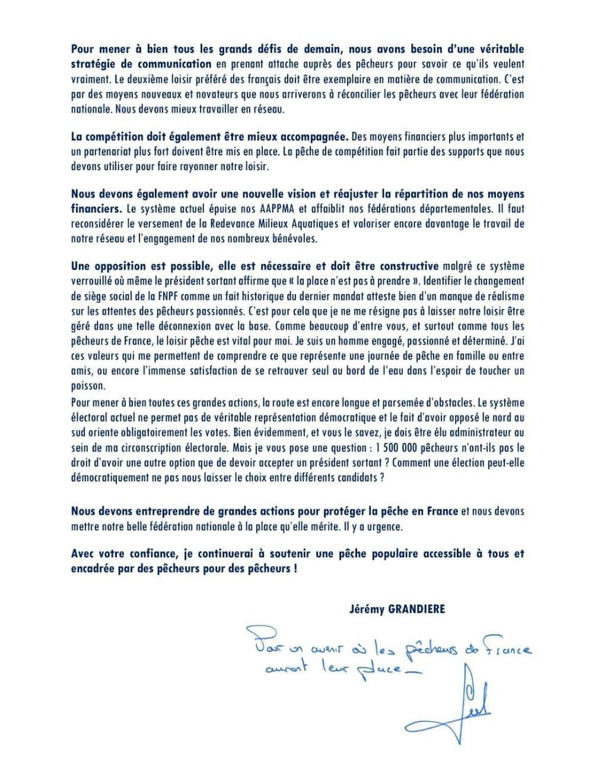 il s’en prend aussi à Claude Roustan, sans le nommer : « une opposition est possible, elle est nécessaire et doit être constructive malgré ce système vérrouillé où même le président sortant affirme que »la place n’est pas à prendre ». Identifier le changement de siège social de la FNPF comme un fait historique du dernier mandat atteste bien d’un manque de réalisme sur les attentes des pêcheurs passionnés ».