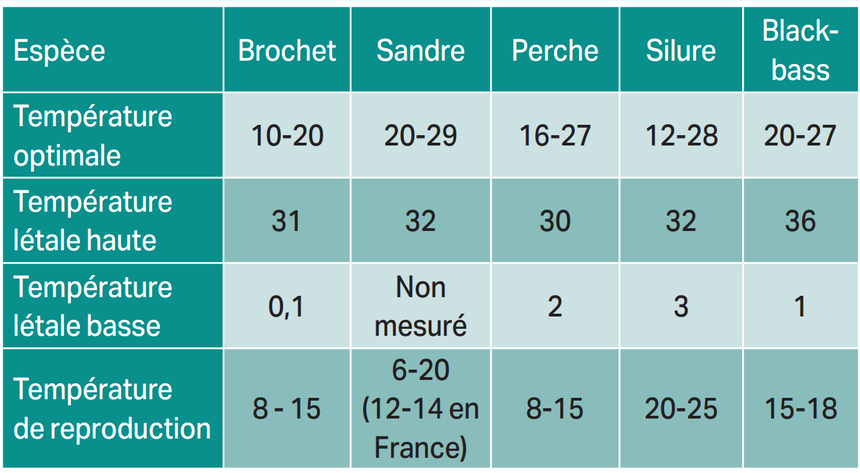 La plupart des réactions chimiques sont d’autant plus rapides que la température est forte, et celles qui gouvernent l’activité des poissons n’échappent pas à la règle. S’il fait trop froid (par exemple 10°C pour la perche, le black-bass ou le sandre), le poisson ralentit et cesse toute croissance. Qu’il fasse plus chaud et il grandira et s’alimentera d’autant plus vite. Toutefois, il existe un seuil où la température sera trop élevée pour son métabolisme ; il entrera alors en stress thermique. L’animal arrêtera de s’alimenter et se déplacera de plus en plus vite dans l’espoir de trouver de l’eau froide. S’il n’en trouve pas, il cessera tout mouvement. Lorsqu’il dure peu, le stress thermique est vite oublié quand les températures baissent à nouveau. Mais s’il se prolonge, il peut être fatal. Les scientifiques ont donc mesuré, pour chaque espèce, la gamme de température d’activité optimale, ainsi que la température létale. Le poisson peut aussi mourir de froid : une température trop basse peut ralentir son organisme au point de le tuer. Il y a donc aussi une température létale inférieure. Nous avons résumé ces températures dans le tableau suivant.