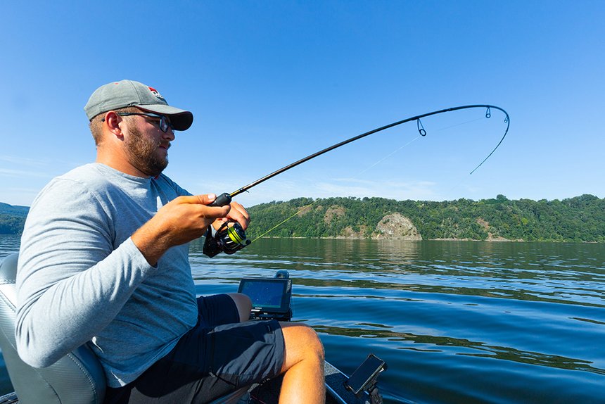 Moment d’hésitation et de doute lorsqu’Arnaud me tend la fine canne à lancer ! J’ai cru, l’espace d’un instant, avoir mal compris ce que nous allions traquer sur le vaste barrage. Je me retrouve avec un fleuret de 2,29 m et d’une puissance de 5 à 25 g. Elle doit être parfaite pour la perche ou le sandre mais le guide m’avait promis de taquiner… le silure. « Ne t’inquiète pas, me lance-t-il sourire aux lèvres. Tu n’auras pas besoin de les brider, il y a 70 m d’eau en dessous d’eux. Avec cette canne, au moins, tu vas t’amuser pendant le combat ! » Et nous voilà partis pour une quête excitante au sondeur.