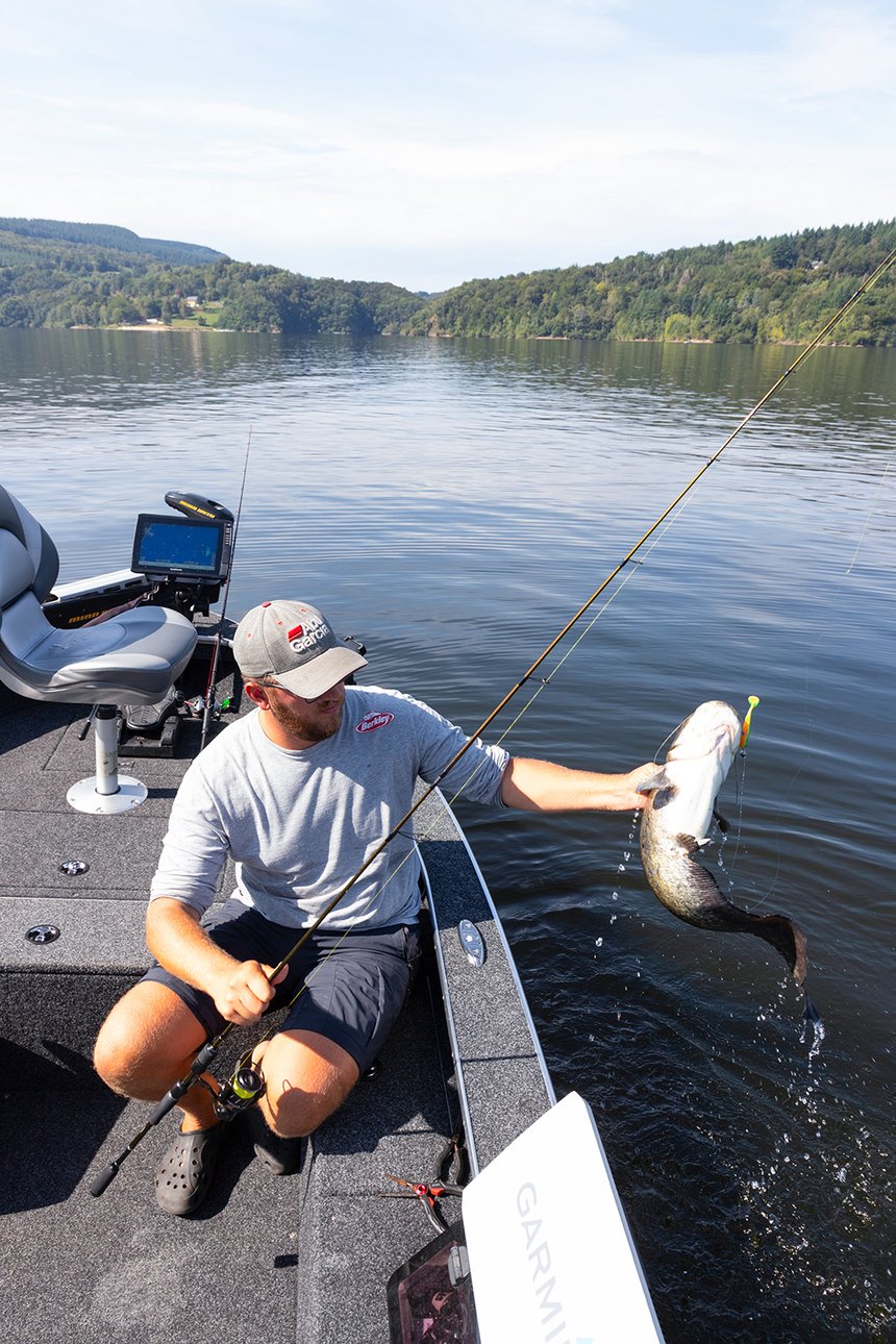 « On peut vraiment se faire plaisir sur de jeunes poissons si l’on utilise le matériel correspondant, assène Arnaud juste avant de mettre le poisson au sec. Je ne suis pas un acharné de la live et de la pêche à l’échosondeur, mais il faut avouer que cette technologie m’a redonné envie de venir pêcher sur le barrage de Bort les-Orgues en été. Sans ces silures et ces appareils, c’est un peu le désert halieutique à cette saison. De nombreux pêcheurs locaux, qui n’ont pas tous de grosses embarcations, se sont également équipés. C’est assez étonnant mais je pense vraiment que ça a redonné un coup de dynamisme localement à la pêche. » Excité, je ne veux plus lâcher la canne et scrute avidement l’écran bleu à la recherche du prochain écho en surface, tout en gardant un œil sur le superbe panorama qui nous entoure. N’en déplaise aux détracteurs de cette technique, on peut aisément faire les deux !