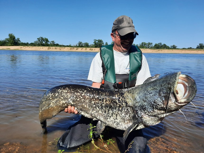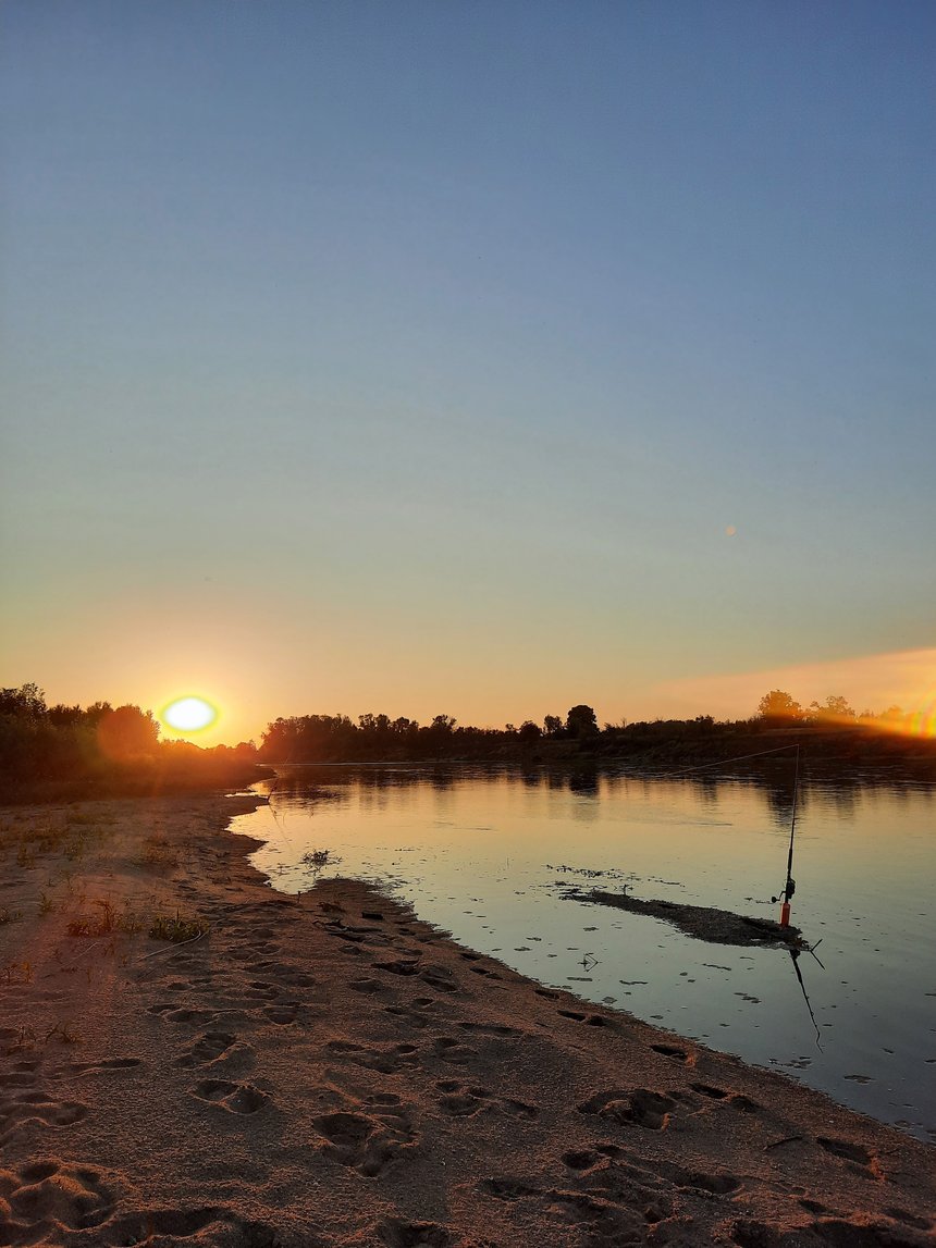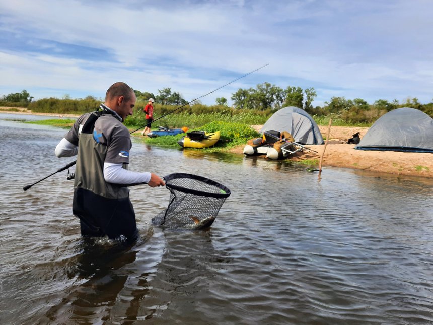 Les silures rôdent, et un manque d’attention peut nous faire passer à côté du roi de ce fleuve sans avoir le temps de lui présenter notre appât. Pour les pêcher, rien ne vaut un beau poisson vivant présenté avec précision sous leur nez. Et à ce petit jeu, Sylvain a l’œil. Au détour d’un herbier, il a repéré une queue de silure. Il fait passer le poisson appât au plus près de l’herbier, lorsque le silure sort et engame l’appât. Attaque à vue, double ferrage en règle et voilà un combat musclé qui s’engage. Il se soldera par un superbe silure de plus de 175 cm. Les hostilités sont lancées et c’est Lubin qui attrapera le deuxième silure de la journée. Il l’avait repéré en bordure dans des bois morts. Une approche discrète et une présentation subtile n’ont pas laissé indifférent ce silure de 140 cm qui a littéralement gobé son poisson. Le combat n’était pas gagné d’avance, mais Lubin, même s’il est jeune, sait parfaitement combattre ces géants d’eau douce. La traque des silures à vue est excitante sur la Loire. Chaque poisson est vu, approché et pêché. Tous ne sont pas capturés, évidemment. Certains se décrochent, d’autres refusent les appâts, mais à chaque approche l’adrénaline est à son maximum. C’est cette adrénaline, ces moments hors du commun qui nous font vibrer et nous font prendre conscience, nous pêcheurs, du pourquoi nous sommes là, sur l’eau, au milieu de cette Loire sauvage. La journée touche à sa fin, il est temps de monter le bivouac pour dormir au bord de l’eau. Je me suis occupé de capturer quelques vifs pour mettre des lignes au cassant sur le coup du soir, pendant que Sylvain et Lubin montent le camp.