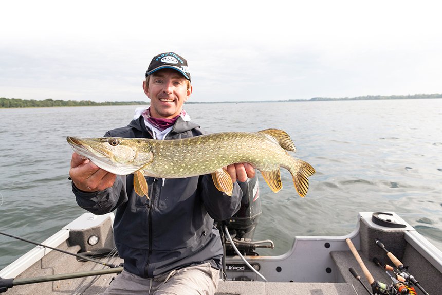 À plusieurs reprises, je repère dans les vagues des chasses de perches. Ni une ni deux, nous lançons alors nos petits leurres vers les éclaboussures. Seul Jacques parvient à piquer deux zébrées de taille moyenne. Plusieurs fois, je pense tenir une belle « perchaude », mais ce sont de petits brochets qui se lancent à la poursuite de nos leurres. Nous repassons donc à de plus gros leurres et prenons encore quelques brochets vigoureux au crank, alors que les vagues s’estompent doucement et le nombre de touches avec… Avec notre guide, nous faisons le même constat, certains éléments météo exercent une énorme influence sur le comportement des brochets qui passent rapidement de la frénésie à l’apathie parce que le vent est tombé et qu’un soleil perçant est de retour. En tout cas, nous avons fait le constat que le lac de Plobsheim est vraiment très riche en brochets et passionnant à pêcher. Selon Jacques, si la pêche du sandre vous intéresse, c’est au moment des grandes crues du Rhin qu’il faudra tenter votre chance avec lui. La pêche du silure reste, quant à elle, possible toute la saison. Un pêcheur du cru nous a d’ailleurs confié en avoir pris un d’1,60m lors de notre arrivée. Je ne saurai trop vous conseiller de contacter dès à présent Jacques afin d’organiser avec lui un séjour sur ce magnifique lac. Très professionnel, convivial, sympathique et doué d’une bonne expertise, il saura vous mettre dans les meilleures conditions pour que votre passage en Alsace reste gravé dans votre mémoire !