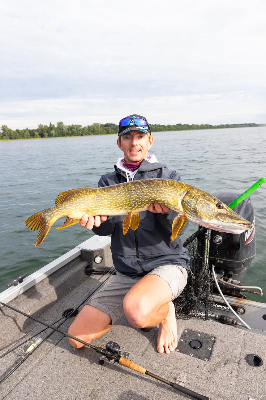 Passionné de pêche, Jacques avait envie de transmettre sa passion et il a donc passé le BP JEPS « moniteur-guide de pêche » pour accompagner des pêcheurs en toute sécurité et leur faire découvrir différentes techniques. Sur son bateau, l’ambiance est conviviale, et Jacques ne néglige aucun détail. Le lendemain, dès 6 heures du matin nous arrivons à la mise à l’eau pour profiter de la fraîcheur. La météo a changé, le ciel est couvert, les vagues font bouger le lac, on se regarde tous les trois en se disant que ça sent bon le brochet. Un coup de barrage sur le Rhin a teinté l’eau du côté du pont, Jacques décide donc de nous faire découvrir le fond de cette retenue de délestage du fleuve. En début de dérive, Jacques ferre une belle touche et c’est un beau brochet de 80 cm qui arrive dans l’épuisette. Pas de doute, notre guide a trouvé la bonne récupération et le bon leurre, puisqu’il touche coup sur coup cinq brochets dont le plus gros atteint 90 cm. De son côté, Lyonel manque un grand nombre de touches en pêchant à la Miuras mais finit par prendre plusieurs brochets autour de 80 cm. Quant à moi, je fais de même en trouvant la cadence de récupération de mon soft swimbait. Comme les fonds sont tapis d’herbes, il faut trouver la vitesse à laquelle le leurre doit évoluer afin de déclencher les touches. Trop lourd ou pas assez vite, le leurre est pris au piège. Trop vite, les brochets l’ignorent aussi. Dans ces conditions, les soft swimbaits en 18, 20 et 23 centimètres s’en sortent très bien. Avec le ciel couvert, les coloris assez clairs ont bien fonctionné tout comme les modèles ayu, dos vert de type UV perch. Les brochets du lac sont magnifiques, très élancés, avec une belle robe dorée. Nous sommes aux anges !
