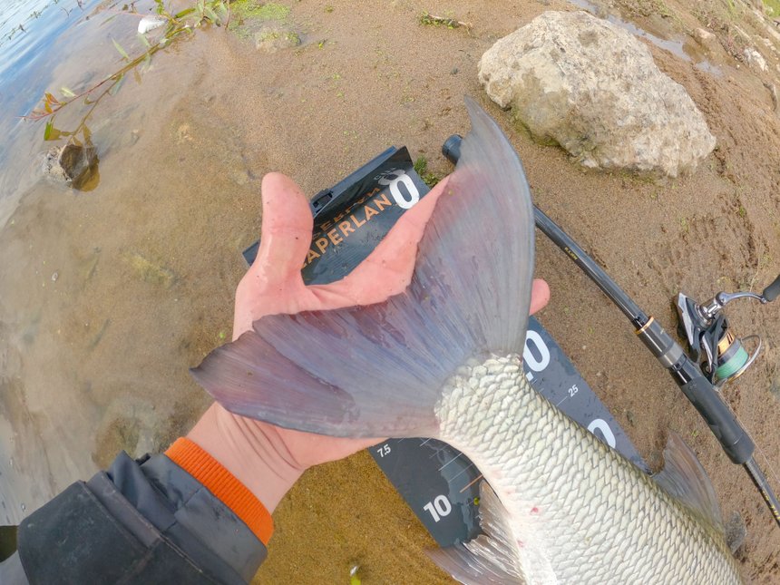 Ses nageoires, et notamment sa dorsale et sa queue, sont pointues et reconnaissables à l’état adulte. L’aspe est dépourvu de dents maxillaires et possède uniquement des dents pharyngiennes pour broyer ses proies. Sa mâchoire inférieure est plus longue et pointe vers le haut. Elle est dotée d’un bourrelet terminal épais qui la caractérise. Il possède des flancs argentés et un dos bleu-vert à gris-vert, ses nageoires sont la plupart du temps anthracite, mais certains sujets juvéniles arborent des nageoires ventrales orange ou rouges.