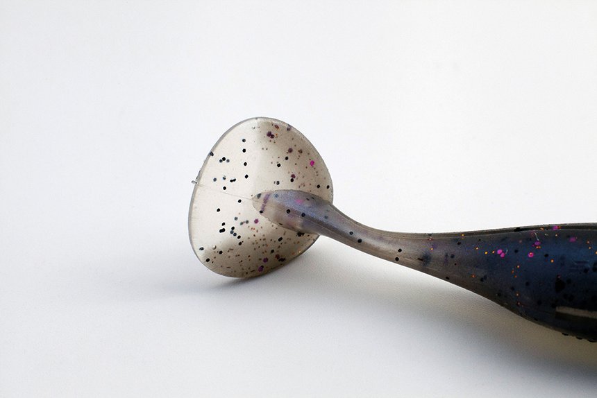 Un shad classique est composé de trois parties: corps, flap caudal (partie mobile de la queue) et pédoncule caudal, qui relie les deux. En jouant sur ces trois parties ainsi que sur la dureté de la gomme, on détermine sa nage.