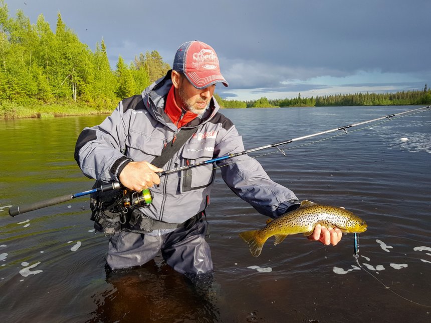 Le premier critère du choix de cette canne concerne la longueur. On avait coutume de dire il y a quelques années, surtout à l’époque où l’on pêchait encore régulièrement au poisson mort, qu’une canne de 2,50 à 3 m était la mieux adaptée pour pêcher depuis le bord. Aujourd’hui, à l’heure où les pêches aux leurres se sont généralisées, on aurait plutôt tendance à préconiser l’utilisation d’une canne plus courte, de 2,20 m (petites rivières) à 2,50 m (grandes rivières), même si les modèles très longs (2,70 m et plus) ont encore leurs adeptes. La puissance et l’action de ces cannes doivent apporter le maximum de polyvalence. On choisira les modèles « medium-light » dotés d’une large plage de puissance, 7-28 ou 7-35 g, par exemple – on trouve même aujourd’hui des 5-40 –, ou « medium » avec des plages de 10-35 ou 10-40 g, d’action de pointe pas trop marquée. Et si vous n’avez pas les moyens de vous offrir des cannes à prix d’or, rassurez-vous, car il existe de nombreux modèles chez Daïwa (Prorex XR), Shimano (Technium Ax Predator) ou Sakura, par exemple, qui font parfaitement l’affaire pour 90 à 150 €. Vous aurez peut-être un peu de mal avec elles pour extraire un gros brochet d’un amas de branches ou mater rapidement un silure de taille moyenne, mais vous vous ferez plaisir avec la plupart des carnassiers que l’on rencontre dans nos rivières. Le moulinet le mieux adapté à cette pêche itinérante et polyvalente est un modèle de taille moyenne, un 2 500 ou 3 000. Il doit tourner parfaitement et posséder un frein fiable et très progressif. On a aujourd’hui l’embarras du choix dans cette gamme de moulinets, depuis les objets qui font rêver mais coûtent plus de 400 €, jusqu’aux produits tout à fait satisfaisants que l’on trouve pour une centaine d’euros. On les équipera d’une tresse assez fine, mais sans excès (12/100), prolongée d’un monobrin fluoro de 25 à 40/100 selon le type de leurre utilisé et l’encombrement des postes.