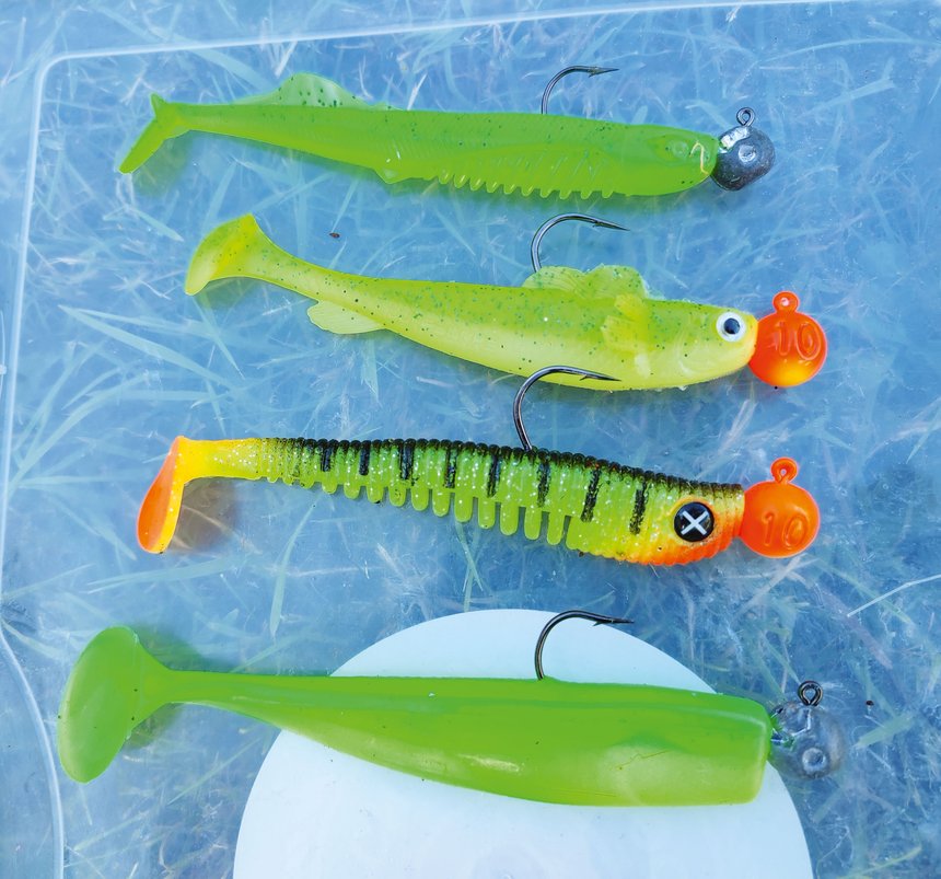 Concernant la taille, il est toujours pertinent d’en changer assez souvent, dans une gamme de 1 à 4 pouces en été et en début d’automne et de 2 à 6 pouces (voire plus) en milieu et fin d’automne et pendant l’hiver. Commencez par les leurres les plus volumineux, avant de baisser la taille, surtout si vous enregistrez quelques touches infructueuses. Concernant la forme générale, moins les sandres sont actifs et plus on choisira les shads longilignes offrant peu de rolling. Aucun conseil sur la couleur n’est vraiment utile, puisque chaque pêcheur a ses certitudes. Pour ma part, j’aime bien changer radicalement de « famille » de couleurs lorsque cela ne marche pas, plutôt que de proposer de micro-nuances différentes. Par « famille », j’entends les verts chartreuse et bleus, les blancs et crèmes, les marrons-noirs-verts « éteints », les rouges-roses-parmes-violets et les bi- ou multicolores (violet-blanc ou jaune-noir, par exemple). Enfin, quels que soient la forme et le type de montage utilisés, il faut adapter le grammage à la taille du shad choisi pour conserver un aspect « naturel » à l’ensemble et varier sans cesse les animations, en linéaire, stop and go ou minimalistes, à ras du fond. On l’aura compris, il est préférable de posséder dans ses boîtes une belle collection de shads si l’on veut faire face à toutes les situations !