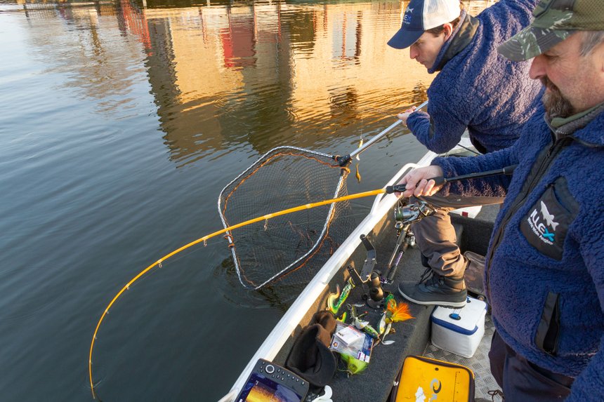 Hors période de crue, quand les carnassiers vont se coller contre la bordure ou rentrer dans les darses, l’hiver se caractérise par des poissons qui vont se positionner dans les fosses. On y retrouvera pêle-mêle des brochets, des sandres et des silures en pleine fosse et des perches sur le pourtour. La pêche en bateau permet de chercher ces poissons et les techniques insistantes comme la verticale lourde se révéleront plus rentables que le linéaire près du fond. Équipez-vous d’une canne verticale d’une puissance MH apte à combattre brochets et silures et une canne très typée leurre souple en puissance M pour rechercher en priorité le sandre, mais étant capable de résister à un rush de beau brochet. Du bord, il faudra lancer loin et lourd pour transpercer rapidement la couche d’eau et atteindre la bonne profondeur sans être emporté par le courant. Dans ce cas de figure, c’est toujours une canne MH, mais bien plus longue qu’une canne bateau, qui sera appropriée pour une pêche à gratter au leurre souple. Une canne ML, elle aussi longue, sera indiquée pour rechercher les perches près des vestiges d’écluses détruites ou de structures connues qui sont très souvent d’excellents postes hivernaux.