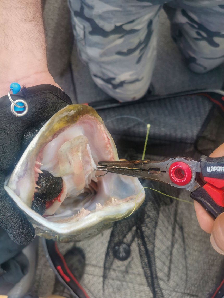 Dans la suite logique de ce petit matériel viennent les pinces. Celles-ci sont absolument indispensables dans la pêche du brochet. J’en ai toujours toute une panoplie à bord qui me permet de parer à tous les besoins. La pince standard tout d’abord, avec laquelle je décroche les poissons. J’aime bien les modèles courts qui cumulent puissance et efficacité. Elle permet d’intervenir avec précision sur les bords de la gueule ou à travers les ouïes, si besoin, pour décrocher les hameçons. Elle me sert également pour une multitude de petits bricolages. J’ai également une pince longue qui facilite l’intervention au fond de la gueule du poisson sans prendre de risques inutiles. Je ne l’utilise pas souvent mais elle est parfois très pratique. Rarement présente à bord mais pourtant indispensable, la pince coupante devrait être obligatoire pour la sécurité des poissons et pour la vôtre ! Il arrive régulièrement qu’un poisson soit mal piqué. Entendez par là que les hameçons sont très mal placés, ou que plusieurs branches des triples soient plantées en opposition (il est très difficile d’en retirer une sans « arracher » l’autre). Dans ce cas, il ne faut pas hésiter à couper ces triples pour sauvegarder l’intégrité du poisson. Un triple, ça se change facilement, et ça tombe bien, vous en avez avec vous ! Par ailleurs, cette pince coupante peut être aussi bien utile quand ce n’est pas le poisson qui est « agrafé »… mais le pêcheur ! Enfin, j’ai aussi dans ma caisse une bonne pince à anneaux brisés qui me permet de changer aisément les hameçons et qui me facilite tous les montages !