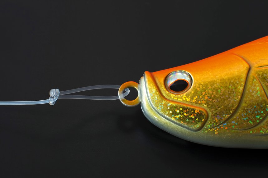 Quand on utilise un bas de ligne en gros fluorocarbone (minimum 70/100), on fait fondre une extrémité à la flamme et on l’écrase avant qu’elle ne refroidisse pour former un champignon. On forme ensuite un nœud simple et on passe le champignon dedans. Une fois le nœud serré, plus on tire plus ça bloque. La raideur du fluoro permet de desserrer l’agrafe pour changer de leurre. Ce système est idéal pour les gros leurres car le champignon ne passera pas dans les plus petits œillets.