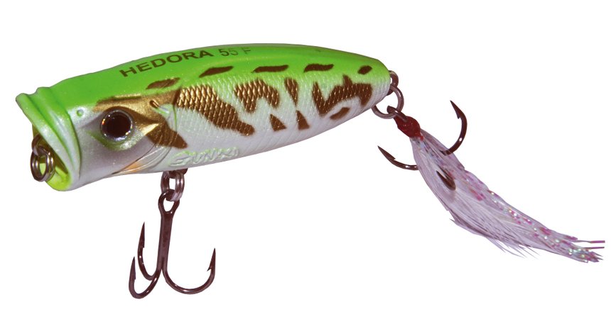 Le Mini Popper proposé par Prorex est particulièrement séduisant avec son teaser en plumes et tinsel argenté. À l’arrêt, le leurre flotte avec une légère inclinaison. À la tirée, il provoque de belles gerbes d’eau, impressionnantes pour sa taille, tout en émettant un bruit modéré provoqué par ses billes bruiteuses. Le Mini Popper répond très bien à une récupération en walking the dog. Une animation faite de glissades et de zigzags ponctuée de petites pauses convient aussi parfaitement. Le popper se lance facilement à condition d’utiliser une tresse fine, pas plus de 10/100 si possible. Perches et chevesnes seront les cibles privilégiées. Signalons également, car c’est un élément tout aussi important au moment du choix, son excellent rapport qualité-prix !