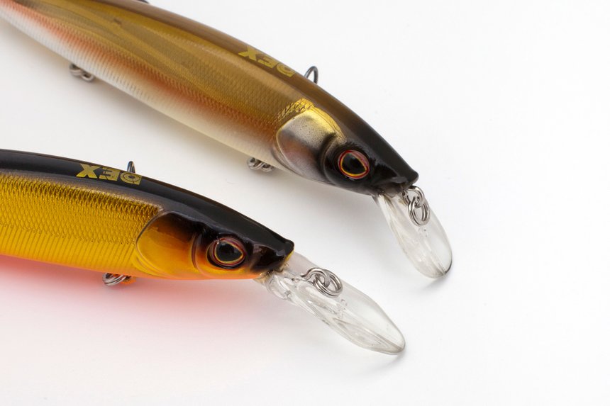 Le Stunna 112 en fait partie et nous avons pu le tester en avant-première. Il s’agit d’un jerkbait minnow d’apparence assez classique : 11cm pour 14g, équilibrage par masselottes ventrales fixes et bille bruiteuse, transfert de masse, trois hameçons triples, diverses possibilités d’animations. Rien de révolutionnaire donc, mais un soin du détail (hameçons, finition, nage) qui permet à ce leurre, et probablement à l’ensemble de la gamme DEX, de se positionner dans le haut du panier. Le Stunna a été mis au point par un compétiteur américain vainqueur du Bassmaster Classic (Hank Cherry) et, même s’il n’est pas à mon avis exempt de tout reproche (je parle du leurre…), je dois dire qu’il m’a rapporté pas mal de poissons (black-bass et brochets) lors de mes essais, ce qui est le principal. Ce leurre existe en deux versions quasi identiques, seule la bavette change, le Stunna 112 étant la version de base. Il plonge à 1m-1,50m très franchement, c’est-à-dire que, dès les premiers tours de manivelle, on le perd des yeux. Il lui faut donc un peu d’eau quand même pour s’exprimer et, s’il est parfait pour pêcher les extérieurs d’herbiers ou d’obstacles, dans les zones très peu profondes, il prend de l’herbe un peu trop facilement. Ça reste néanmoins jouable en l’animant canne haute au début puis en la baissant au fur et à mesure que la profondeur augmente. L’autre version disponible, le Stunna 112+ descend encore plus profondément (1,50 à 2,50m) grâce à une bavette plus longue (ce qui lui permet de peser un gramme de plus au passage). À moins d’avoir des herbiers situés très en profondeur, c’est plutôt un modèle pour pêcher des pentes prononcées ou la pleine eau, notamment en été quand la chaleur fait que les poissons s’enfoncent et s’écartent de la rive. Au niveau animation, plusieurs options sont possibles: lancer-ramener avec une nage prononcée (mélange de wobbling et rolling), twitching (petits coups secs et rapides du scion) et jerking (coups de scions appuyés et plus espacés). Les réactions du leurre sont assez vives (écarts brusques, flashes lumineux) mais irrégulières. Ce n’est pas un métronome et les écarts ne sont pas foufous. J’ai noté un comportement plus erratique et plus agile chez le 112+.