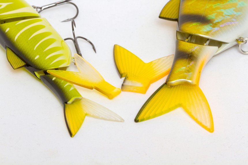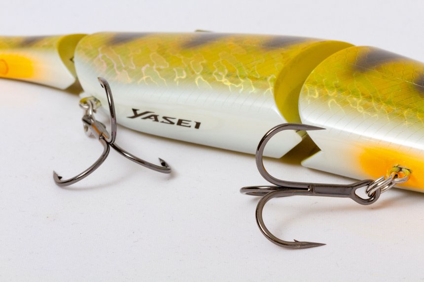 Ce leurre comporte trois segments de longueurs différentes. Fabriqué dans un solide polymère, il n’est pas tout à fait silencieux. La bille de lestage produit un léger cliquetis, sans pour autant ameuter tout le monde subaquatique ! Le corps est assez long, imitant un gros gardon ou une ablette, pour la petite taille, puisque ce Soul Swim est disponible en 16 et 23 cm. L’attache à l’extrémité de la bouche est complétée par un anneau brisé. Une seconde attache est disponible au-dessus de la tête afin de pêcher à la traîne dans les pays nordiques. Il est possible de fixer un petit plomb poire à l’attache avant, le leurre nage alors plus incliné. Chez nous, mieux vaut fixer un petit lest sous le premier triple.