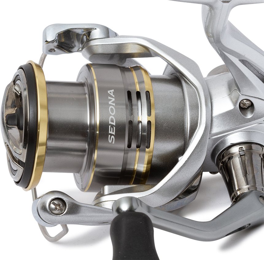 Ce Sedona est passé par de nombreuses finitions au fil des ans. Le bâti fut un temps gris anthracite avec une bobine argentée, le contraste de couleurs était marqué. La version FI, toujours en vente, se pare d’une bobine dorée et d’un corps gris clair. La nouvelle mouture est plus sobre, à l’image de la production actuelle, avec un bâti confectionné en XT-7 gris argent et une bobine presque de même teinte, simplement soulignée de touches dorées sur la lèvre supérieure et à sa base. Le XT-7 est un composite original mis au point par Shimano. Cette matière est légère mais très résistante aux chocs et aux torsions. Cela garantit un bon alignement des engrenages et des pièces mobiles contenues dans l’arrière du Sedona même lors de gros combats.