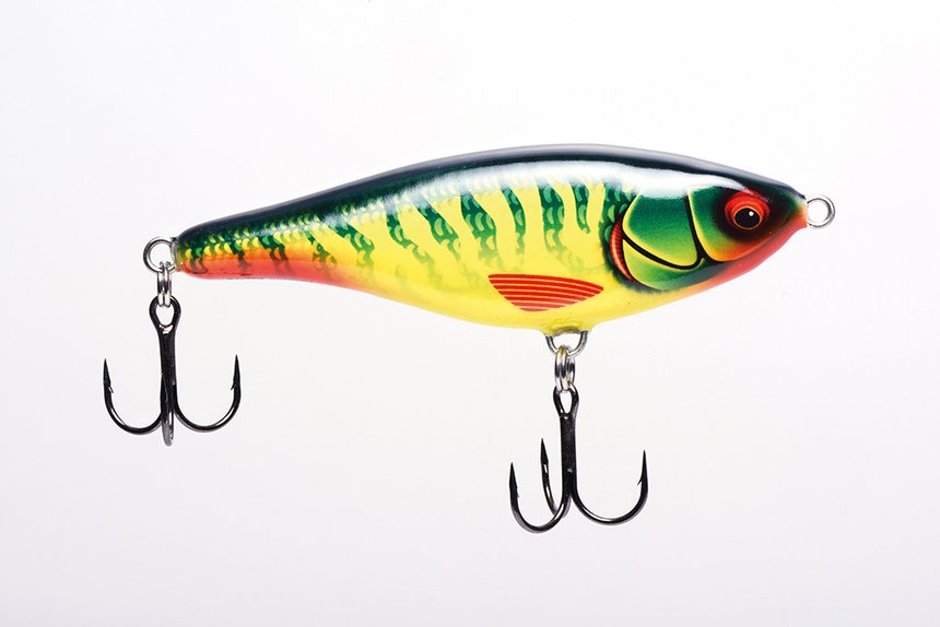 Pas très long, mais avec des flancs hauts, c’est une bouchée substantielle qui s’adresse au brochet, au black-bass, éventuellement au sandre et à différentes espèces exotiques. C’est notamment le type de leurre à avoir absolument pour le peacok bass en Amazonie, où la plupart des jerkbaits classiques pêchent trop creux. Chez nous, le Twitchin’ Rap 12 sera certainement très utile quand il faut un leurre conséquent mais capable de passer dans très peu d’eau, notamment quand il y a peu d’espace entre des herbiers et la surface mais que les leurres de surface ne donnent rien. C’est de mon point de vue le gros et même le principal intérêt de ce leurre, en tout cas, ce qui le distingue sans conteste de la concurrence. On a tous été confrontés à des situations où un jerkbait classique – Buster Jerk, Zalt et même Slider qui pourtant pêche assez haut – posait problème, ramenant de l’herbe quasiment un lancer sur deux même en l’animant canne haute et très vite. Dans ces moments-là, on aimerait avoir un modèle qui descende encore moins et puisse même au besoin pêcher juste sous la surface.