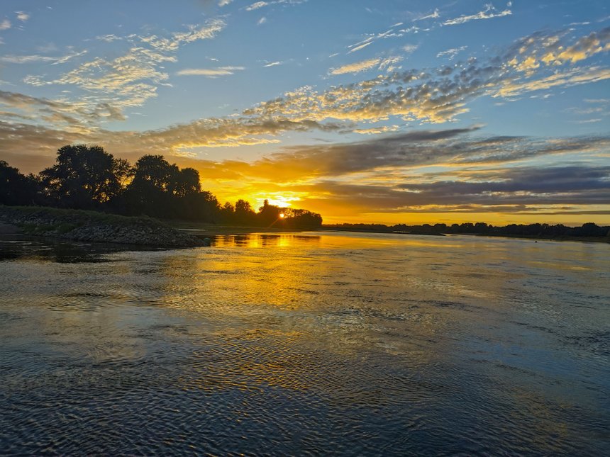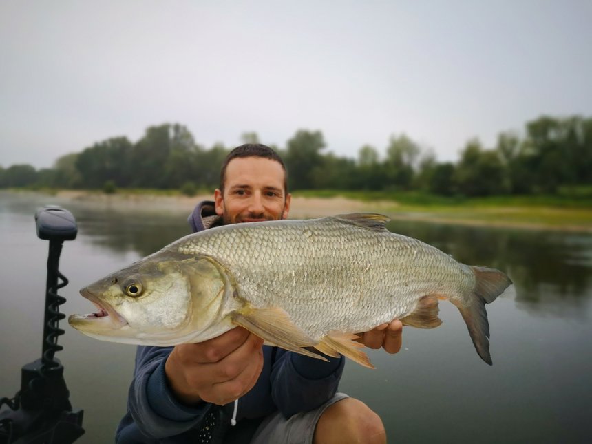 Il est toujours appréciable de se réveiller avec les premiers rayons de soleil, sauf que ce matin-là, il n’y en a pas. Une brume assez épaisse se mélange aux dernières fumées de notre bivouac. Il fait même un peu froid. Un petit café pour se réchauffer, et c’est reparti. Nous continuons notre dérive en ponçant les têtes d’épi, et très vite, après une longue pause sur une animation, nous entendons un gros « splash ». Le leurre est toujours sur l’eau, je reprends l’animation; deuxième « splash », mais cette fois-ci, c’est pendu. Romain annonce directement un beau poisson, le premier rush est sympa. Ensuite, c’est plus une lutte avec le courant qui s’enchaîne, le poisson est dans l’épuisette, un beau spécimen qui frôle les 70 cm. La journée commence plutôt bien. Mais en fait, pas tant que cela. Mis à part cette action, nous passons plusieurs heures sans résultat, sans même voir une chasse. Et toujours dans cette brume froide… Nous décidons alors de remonter sur un spot bien marqué, mais lorsqu’on dérive sur la Loire, on ne se rend pas compte de la distance parcourue. Nous avons dévalé sur des kilomètres.