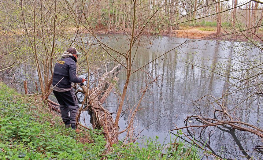 Black-Bass Paradise porte bien son nom ! C’est un domaine privé, situé à Montfort-le-Gesnois, une petite commune située près du Mans. C’est ici, sur les bords de l’Huisne, que Romain et Jessy se sont rencontrés cannes en main quand ils étaient adolescents. Après un début de carrière dans le bâtiment, Romain, qui espérait vivre de sa passion, réalise son rêve en 2017 en ouvrant un centre de pêche, le premier d’une longue série, puisqu’il est aujourd’hui propriétaire de camps au Portugal et en Espagne notamment. Jessy l’a rejoint dans l’aventure comme guide de pêche exclusif pour Pêche extremadura. Le domaine Black-Bass Paradise s’étend sur dix hectares de bois et cinq d’eau, divisés en cinq étangs aux configurations diverses. Le pourtour des étangs a été aménagé pour que l’on puisse évoluer aisément de l’un à l’autre.