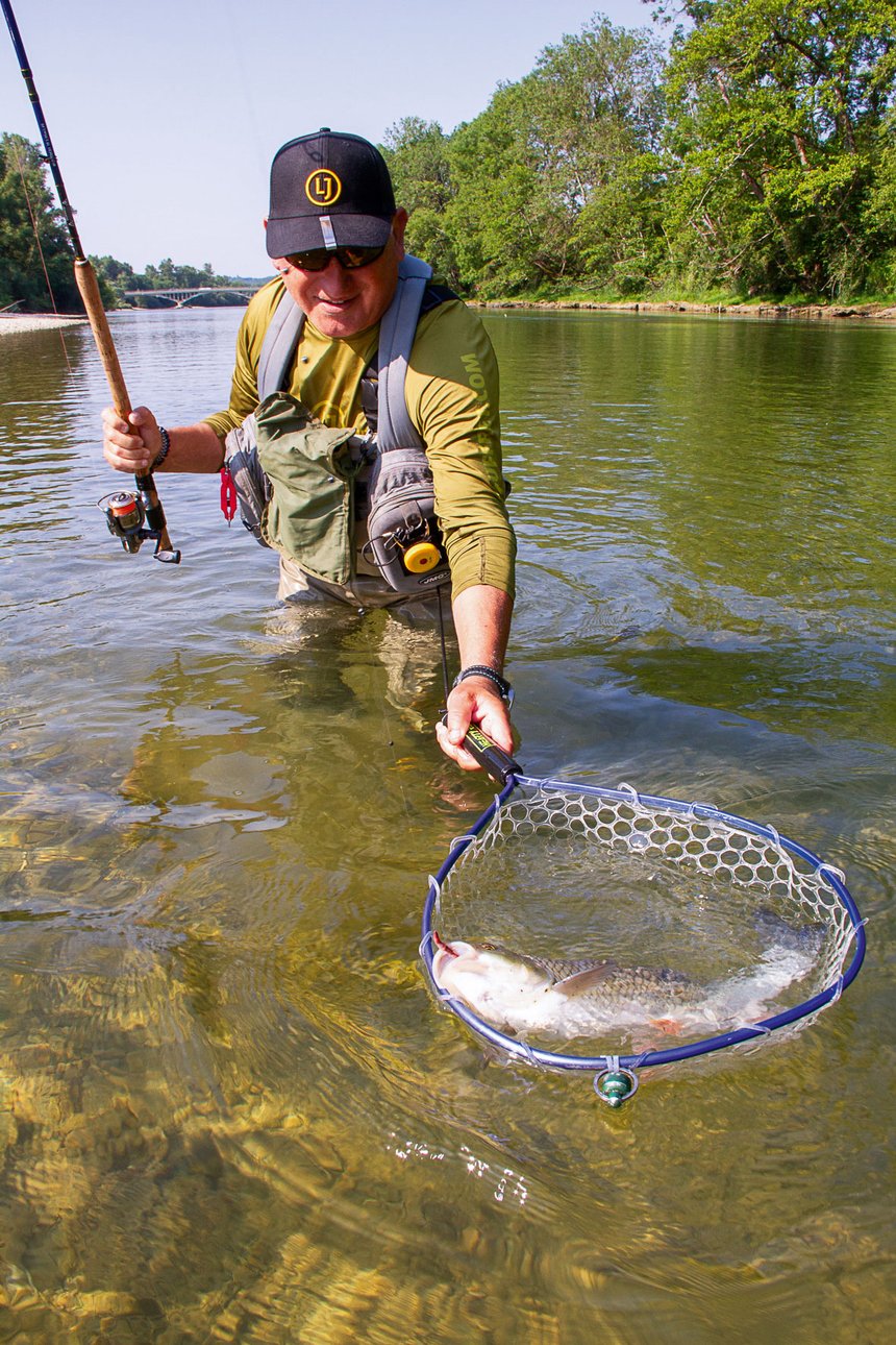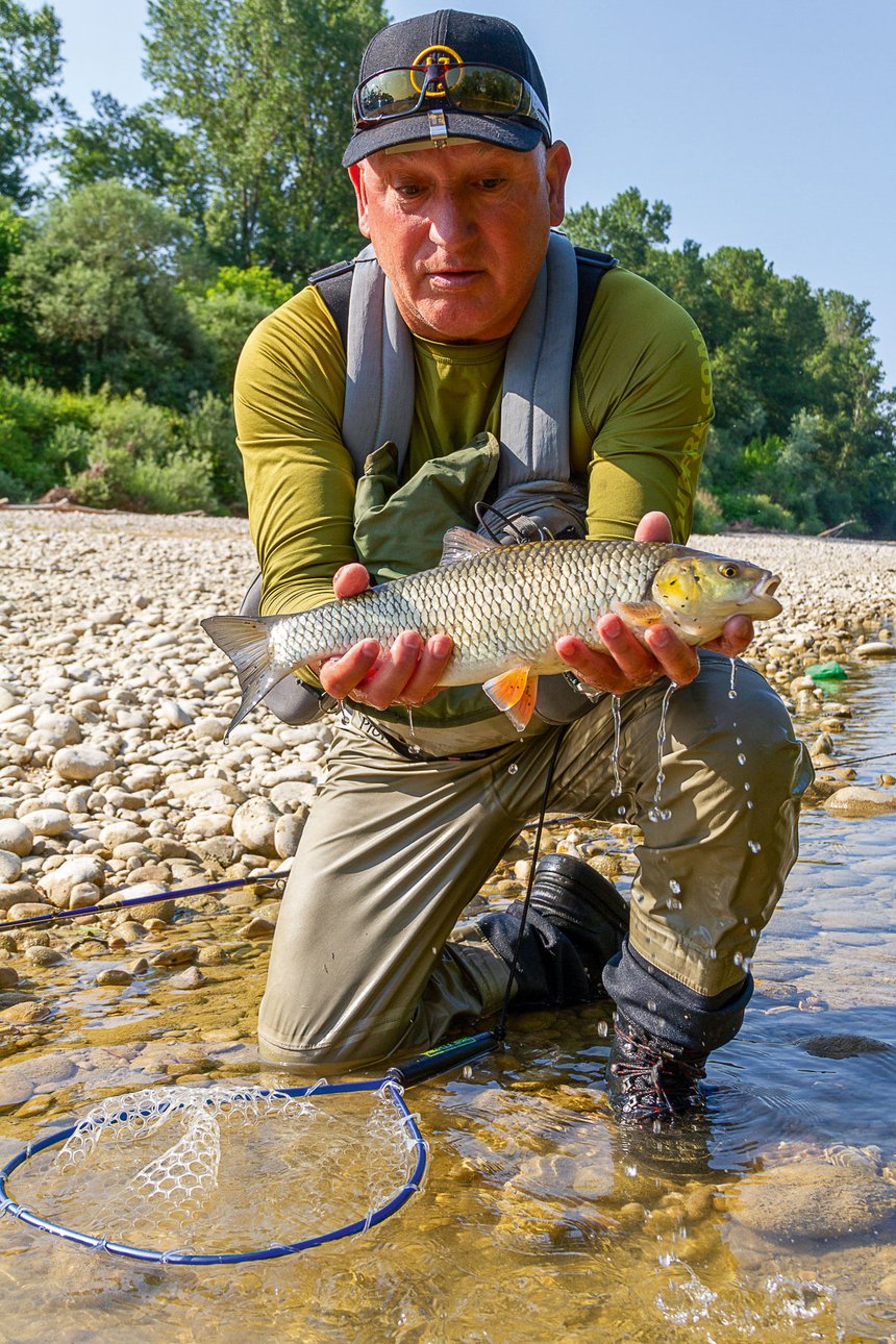 À genoux sur la grève, Tonio ôte avec douceur le petit hameçon planté dans la lèvre charnue et me tend avec précaution le joli poisson pour une prise de vue rapide. L’eau claire et fraîche de l’Ain coule sur les écailles argentées du chevesne. Après quelques secondes, c’est avec un coup de queue rageur que le cyprin retourne dans sa cachette en nous arrosant au passage. Son frère ou cousin en fera de même quelques minutes plus tard. Même sous ce soleil éclatant, Tonio prouve que la pêche aux appâts naturels demeure une technique redoutable pour toucher des poissons toute l’année. « Le chevesne est encore plus difficile que la truite, reprend-il. C’est un excellent entraînement lorsque les farios sont boudeuses comme ce matin ! Et puis, des poissons de cette taille te permettent de te faire la main pour le jour où tu touches une grosse truite. On n’a pas le droit à l’erreur avec eux. »