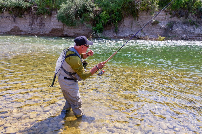 Soudain, il exulte ! Il vient de ferrer une truitelle. « C’est tellement rare ici, je suis très content, cela veut dire qu’il y a encore un peu de reproduction et qu’il ne reste pas que de poissons au-dessus de 40 cm ! » Il faut dire que les juvéniles ne sont pas fréquents dans la rivière d’Ain. Chaque année, des milliards d’alevins de toutes espèces finissent desséchés sur les fameux galets blancs en raison de lâchers intempestifs d’eau du barrage électrique en amont. Les juvéniles sont piégés sur les bordures et ne peuvent retourner dans le lit principal en raison de la baisse brutale du niveau. Une gestion que déplorent les élus fédéraux et associatifs du monde halieutique. En attendant, Tonio me présente le jeune salmonidé dans l’eau, comme une pépite fraîchement trouvée. Les yeux du pêcheur pétillent, son sourire en dit long sur sa passion. De nouvelles générations de poissons arrivent et avec elles l’espoir de belles parties de pêche à venir.
