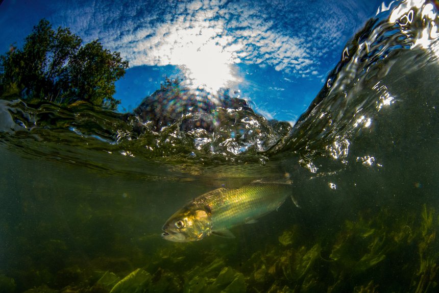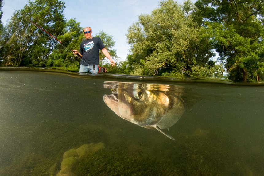 C’est au mois de mai que nous retrouvons Florian, un souriant gaillard blond, par une belle journée ensoleillée sur les bords de la Charente, à Chaniers, pour découvrir la pêche aux leurres de l’alose. Il faut savoir que nos eaux abritent deux aloses : l’alose feinte (Alosa fallax) et la grande alose ou alose vraie (Alosa alosa). Cette dernière est en forte régression depuis quelques décennies, et elle est classée sur la liste rouge des poissons menacés. La réglementation concernant la pêche des aloses varie en fonction des lieux, mais en Gironde, la pêche de la grande alose est totalement interdite. Les aloses sont des poissons osseux possédant une carène ventrale et présentant une silhouette très semblable à celle d’une sardine ou d’un hareng, ses proches cousins. L’alose feinte adulte mesure entre 40 et 60 centimètres pour un poids d’environ 700 grammes. La grande alose, elle, peut atteindre 80 centimètres pour un poids d’1,6 kg. Outre leur différence de taille, les deux poissons présentent des différences de morphologie. On reconnaît l’alose feinte grâce aux taches noires (entre quatre et huit) alignées sur ses flancs, toutefois ces taches ne sont pas visibles sur tous les spécimens. Ses écailles sont régulières et parfaitement alignées sur l’axe longitudinal. La grande alose ne possède qu’une tache derrière l’opercule et ses écailles sont irrégulières et non alignées.