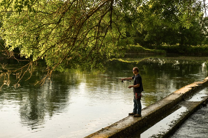 Pour l’instant les choses ne semblent pas gagnées, car les pêcheurs présents sur le site n’ont pas attrapé une seule alose. Nous les interrogeons et cela fait pourtant un bon moment qu’ils enchaînent les séries de lancers sans aucun résultat. Si, à certains moments, les aloses semblent frénétiques et attaquent tous les leurres, il y a aussi de nombreux jours où le poisson semble avoir disparu. Nous préparons notre matériel avec comme musique le son régulier des cuillères qui touchent l’eau. L’absence de touches et de prises de nos voisins pêcheurs ne semble pas affecter notre ami. « Je vais allonger mon bas de ligne en fluorocarbone et pêcher plus fin. Ça peut faire la différence lorsqu’elles sont tatillonnes. » Florian ouvre son sac et recherche le leurre du jour dans une de ses nombreuses boîtes. « L’eau est assez claire, alors on va privilégier des teintes bleutées et argentées qui fonctionnent bien ici. L’orange et le rose donnent également des bons résultats, mais dans des eaux plus chargées ou avec une luminosité plus faible. » Dans la foulée, il nous tend un leurre : c’est une jolie lame de petite taille. « Les aloses aiment le métal et ces microlames sont très efficaces ! Elles permettent de balayer beaucoup de terrain et d’augmenter ainsi les chances de croiser les bancs qui se déplacent beaucoup. Leur seul inconvénient est que j’ai régulièrement des décrochés, mais j’ai rajouté un anneau brisé pour les limiter. »