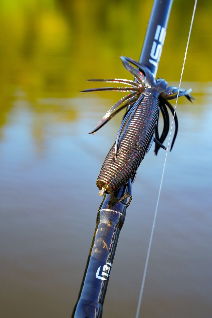 Sébastien décide de passer au leurre souple. Les leurres de réactions, en particulier le buzzbait, ont permis de prendre un très joli spécimen, mais il est temps d’aller chercher les bass dans leurs retranchements. Les carnassiers sont plus timides, ils sont sûrement postés dans la végétation de bordure. Notre passionné monte des leurres souples et des créatures sur des montages texans ou weightless. Une arme redoutable.