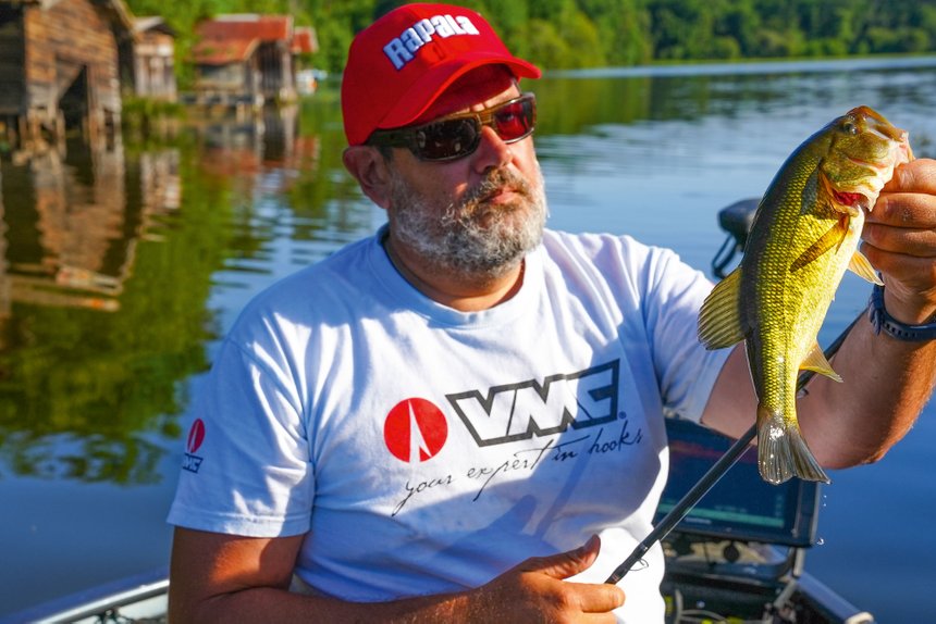 Sébastien privilégie les buzzbaits, bladed jigs et crankbaits pour ces heures matinales. La pêche de surface est aussi efficace avec un stickbait, qui fend la surface aquatique lisse et calme à l’aube. Le temps passe, le soleil se fait plus insistant, les rayons commencent à chauffer l’atmosphère et la brume se forme à la surface du plan d’eau.