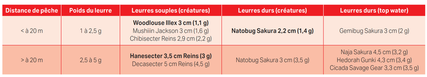 Le leurre de base pour capturer les chevesnes en surface est une imitation d’insecte mesurant de 2 à 4 cm. Même si son allure a une certaine importance, c’est surtout le poids de cette créature qui sera le critère de choix déterminant. Un chevesne posté est, en effet, toujours très méfiant et le simple impact du leurre en surface peut le faire fuir. Toute la problématique consiste donc à trouver le bon compromis entre ce poids (le plus léger possible) et votre capacité à lancer très précisément à la distance du poisson repéré. Notons qu’à masse égale une créature souple est plus discrète qu’en matière dure. Une bonne boîte à chevesnes doit donc comporter une panoplie de grammages pour couvrir les différentes distances de cible. Idéalement la même créature souple déclinée en 4 ou 5 grammages serait parfaite, mais cette option n’existe pas. Il faut donc jouer avec les matières, les marques et les modèles pour obtenir ce panel (voir tableau plus haut). La question de la couleur est plus simple à négocier puisque, pour les petits souples au moins, les teintes sombres sont nettement les plus efficaces. Les modèles disponibles ne proposent d’ailleurs pratiquement plus que cette option: marron, vert très foncé, noir… J’avoue toutefois que les coloris type « bourdon » (jaune et noir) du fameux Notobug de Sakura sont aussi excellents.