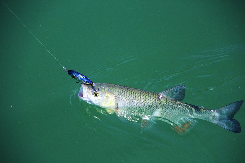 La pêche du chevesne en surface demande une excellente maîtrise des lancers qui doivent être ultra-précis et tout en discrétion. Ils seront facilités par l’utilisation d’un matériel light ou ultra-light. Du bord, j’utilise le plus souvent une canne de 2 m 15 puissance 1-7 g montée, comme pour la truite, avec une tresse fine de 0,06 à 0,08 mm. C’est parfait pour propulser des leurres qui pèsent souvent moins de 3 g. À côté des lancers classiques pour longues distances et espaces dégagés, il faudra utiliser tous ceux qui permettent de se « jouer » de la végétation. Le lancer en cloche est parfait pour passer par-dessus une bande de végétation rivulaire alors que le revers est intéressant quand il faut jeter sous les frondaisons. Ne pas hésiter non plus à utiliser le lancer arbalète pour propulser votre créature dans une minuscule trouée. En général cela fait « mouche » puisque les chevesnes sont toujours moins méfiants quand ils sont sous un tas de branches. Reste à savoir où déposer le leurre par rapport au poisson posté. Pour un individu isolé, deux stratégies complémentaires se dégagent: lancer 1 à 2 m en amont pour que l’imitation dérive vers lui ou juste derrière pour qu’il se retourne et attaque le leurre par réflexe, sans trop avoir le temps de l’examiner. Rarement, mais quelquefois, il peut être rentable d’animer un peu la créature. Cela soit en la faisant sautiller quasi sur place, soit en la déplaçant lentement pour simuler l’effet de fuite.