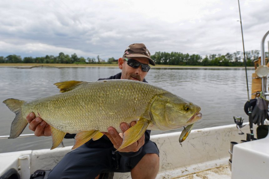 Pas d’activité apparente. Un ciel nuageux se reflète sur la surface du fleuve aux accents métalliques. Pas un bruit non plus. La clarté de l’eau donne l’impression de naviguer dans un immense aquarium où des fonds sablonneux alternent avec des fosses plus sombres jonchées de bois morts. Aux zones de courant prisées par les barbeaux succèdent des radiers, tels d’immenses flats. Simple échauffement ou véritable prémonition, Lionel saisit sa canne et propulse un stickbait au ras d’une berge plus encaissée afin de lui faire traverser une accélération du courant. Son leurre n’est pas arrivé à mi-chemin qu’il disparaît dans une aspiration. Le frein chante, et le poisson a effectué un rush de 25 mètres plein aval. Lionel est à la manœuvre, monté sur la poupe de son bateau à fond plat. Aucun doute, c’est un aspe, et un beau spécimen qui défend chèrement ses écailles jusqu’à la mise à l’épuisette! Le verdict tombe : 82 cm. Un coup de maître ! La confirmation que les aspes (Leuciscus aspius), grégaires, sont bien sur zone même s’ils ne se manifestent pas encore en surface. L’absence de soleil qui tarde à percer ? Pas facile d’avancer une théorie avec ce diable de carnassier, aussi facétieux que tempétueux. Une chose est sûre, sa population ne cesse de croître depuis quelques années sur le fleuve. « Je le recherche spécifiquement depuis cinq ans pour le bonheur de mes clients qui en redemandent. C’est un magnifique poisson de sport dont les mœurs sont parfois mystérieuses. Il en est d’autant plus intéressant à traquer. Sa pêche de surface est l’occasion de faire le plein d’adrénaline a fortiori quand on les traque à vue », explique Lionel.