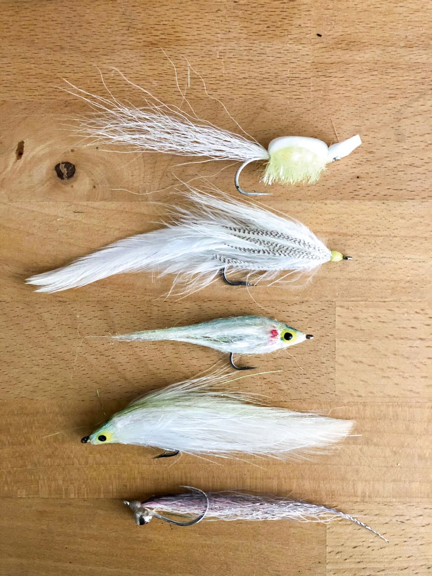 Les streamers de petites tailles (7 à 10 cm), imitation plus ou moins réaliste du poisson fourrage du moment, s’avèrent efficaces. Ils doivent être faciles à lancer et permettent de couvrir différents niveaux : de la surface à 1 m en dessous. Les montages de type soft hackle (à base de plumes de marabout) offrent légèreté et mobilité attractive.